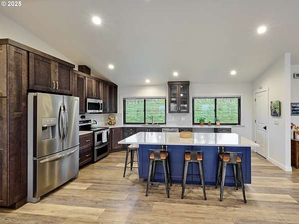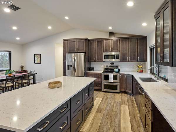 - Builtin Refrigerator, Dishwasher, Disposal, Free Standing Range, Free Standing Refrigerator, Island, Microwave, Pantry, Quartz, Stainless Steel Appliance