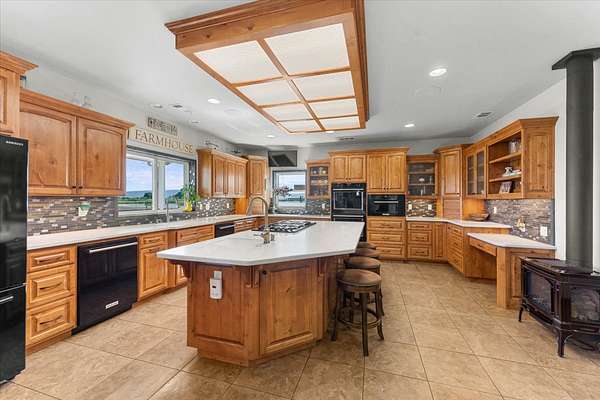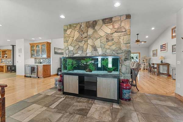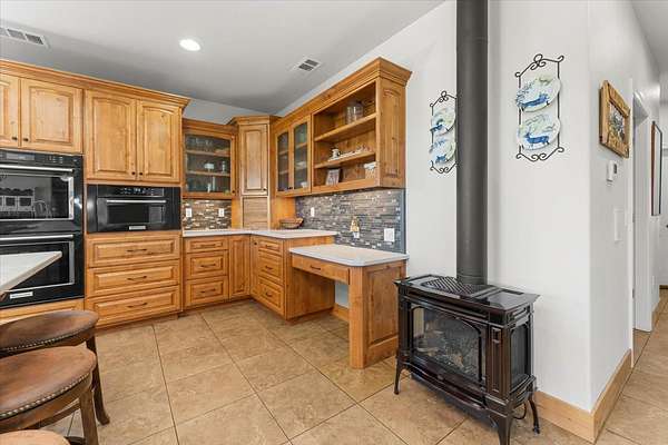 KITCHENand DINING: Custom design. Corian counters with tile backdrop, knotty alder cabinets, some glass facing. Center island with prep sink, 6 burner gas range and bar stool area. Baking cabinet, 2 dishwashers, double oven, built in microwave, warming oven and refrigerator. Side bar has sink, ice maker and beverage refrigerator. Corner gas stove, heated tile floors and walk in pantry. Dining area has hickory flooring, skylight, open to kitchen living area.