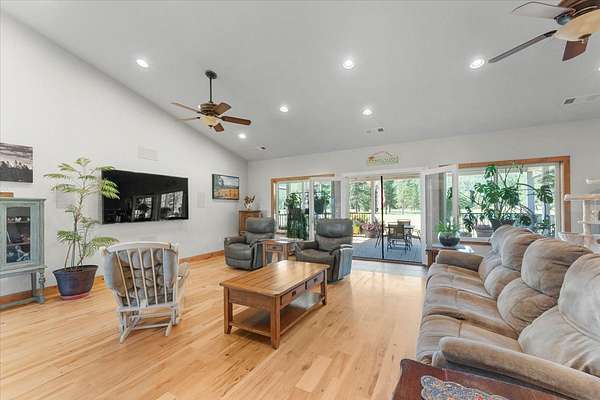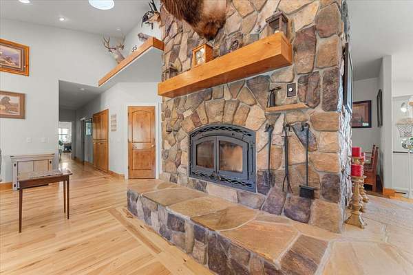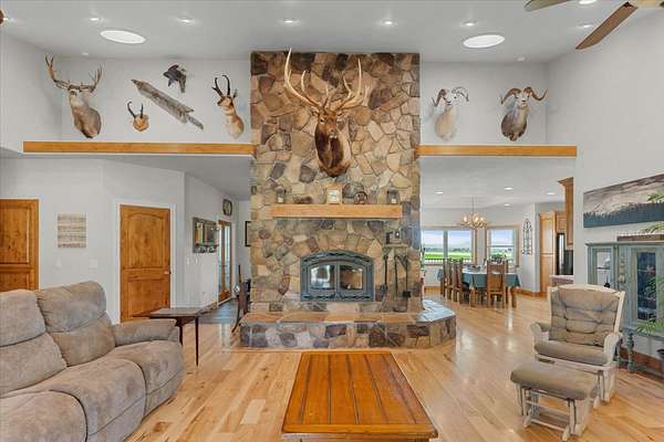 LIVING AREA: Spacious room with high ceilings, hickory flooring, glass doors to covered back deck. Unique stone wall with fireplace and tile landing.