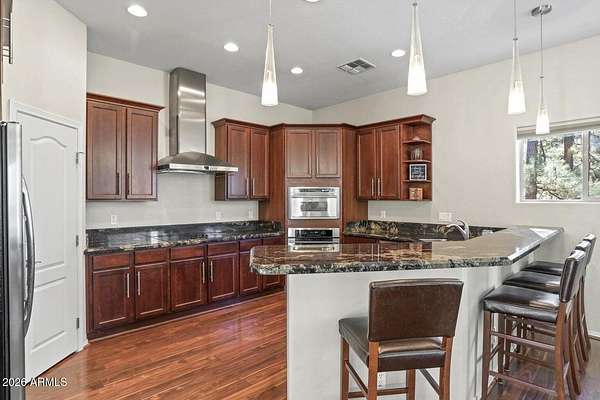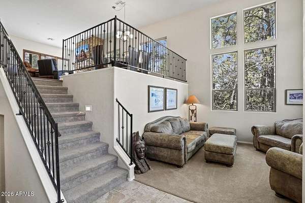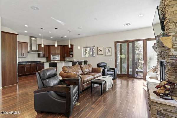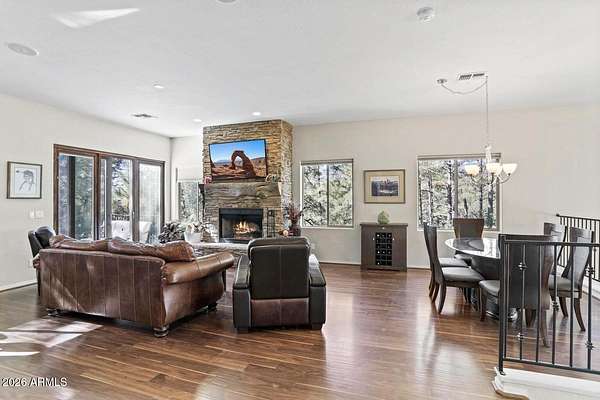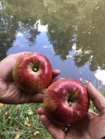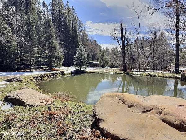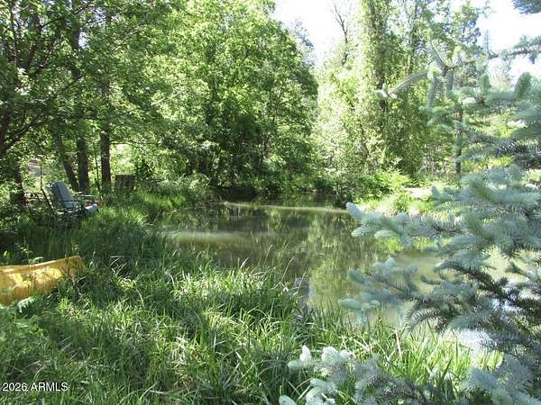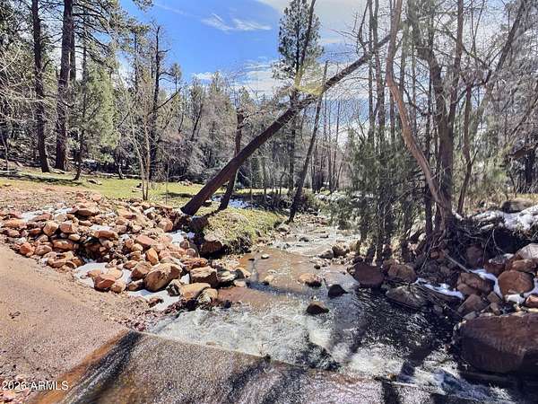 Exceptionally rare opportunity to own over 400 feet of year-round East Verde River frontage on a 3.42-acre private parcel featuring tranquil ponds and 100-year-old apple trees. This stunning custom home is perched approximately 300 feet above the river, offering breathtaking Mogollon Rim views while still allowing you to hear the soothing stream from the home with windows open. The home features 4 bedrooms, a theater room, living room, and great room, highlighted by exquisite granite countertops, a wood-burning stone fireplace, and laminate wood flooring throughout. The primary suite offers its own private deck with breathtaking Rim views, while the primary bath includes a jetted tub, walk-in shower, and spacious walk-in closet. An additional deck off the great room provides the perfect space to relax and enjoy the serene surroundings. The entire exterior of the house was repainted in February 2026. The lower portion of the property fronts the East Verde River and includes a barn, offering serene water views and seasonal fishing opportunities. Ideal for horses, riding quads directly from your doorstep, or simply enjoying the natural beauty. Towering Ponderosa pines surround this magical, private setting. Conveniently located just 25 minutes from Payson for shopping and dining, and 45 minutes to the lake for boating and fishing. The lower portion of the lot lies partially within a flood plain. County assessor lists the home at 2,445 sq. ft.; previous owners were informed by a builder that the home measures approximately 2,701 sq. ft. Buyer and Buyer's Agent to verify all facts and figures deemed important. Information deemed reliable but not guaranteed. Make memories here as this one-of-a-kind riverfront retreat won't last. *Some exterior photos were taken in prior seasons/years to illustrate the property's seasonal landscaping and foliage.