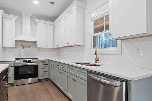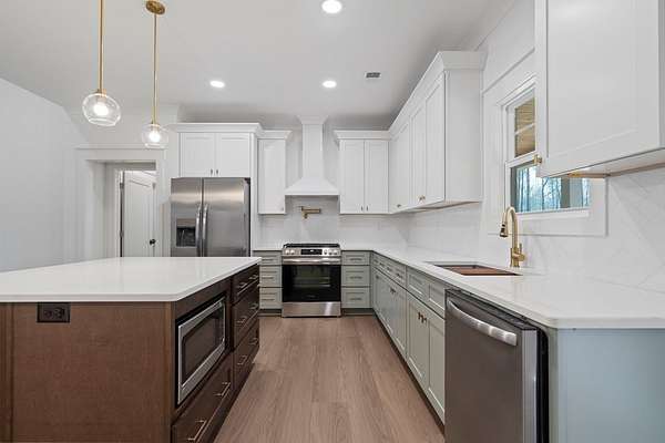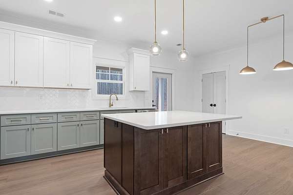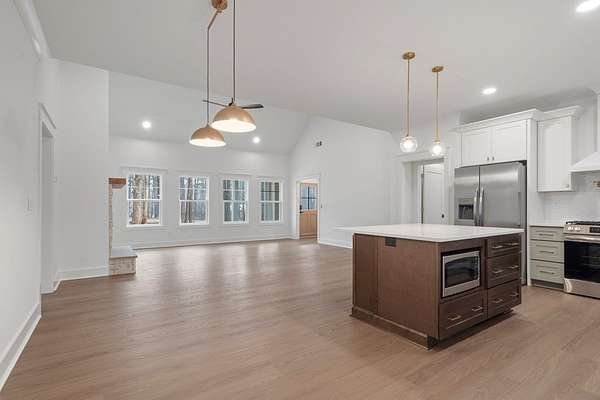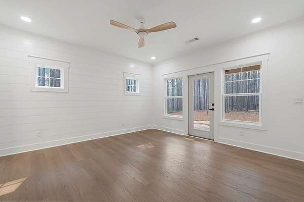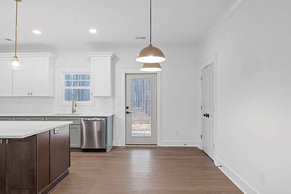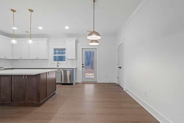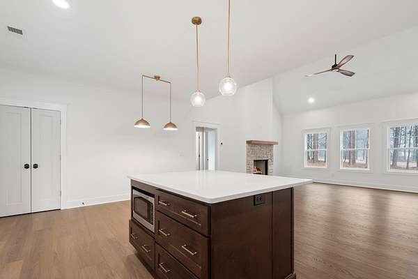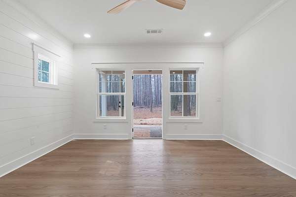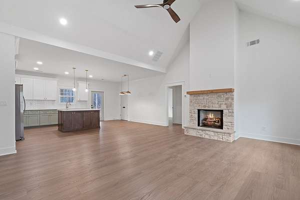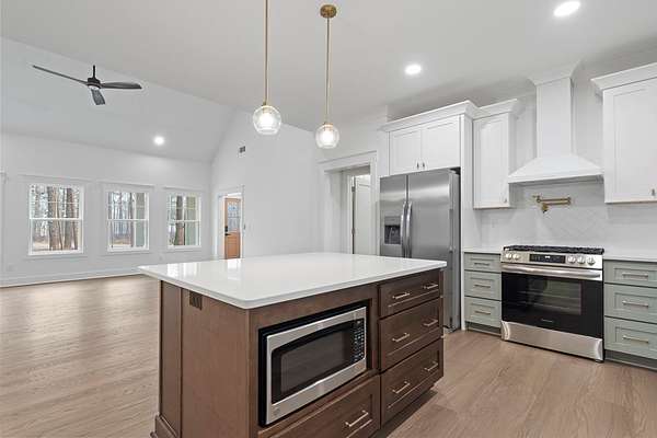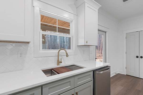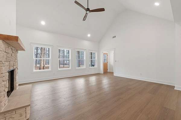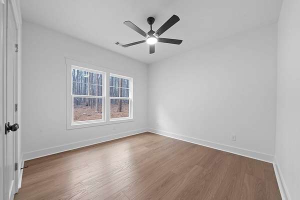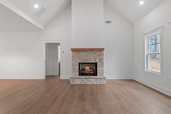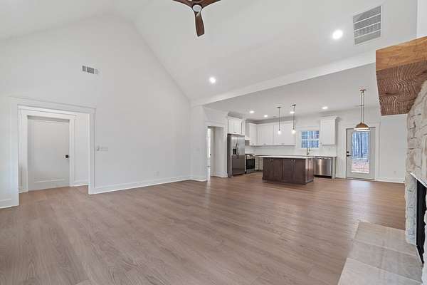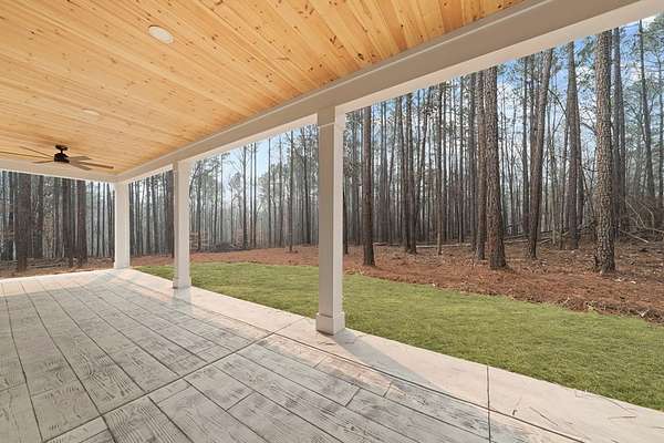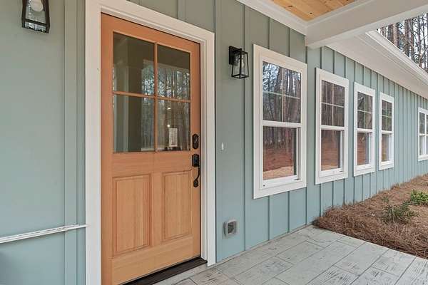 Brand new construction near Lake Sinclair offering space, privacy, and thoughtful upgrades on nearly 2 acres. Situated on a beautifully shaded 1.98-acre corner lot, this 3 bedroom, 2 full bath home provides 1,696 square feet of well-designed living space surrounded by mature trees and natural privacy. Step inside to an open-concept layout with durable LVP flooring, upgraded trim details, and custom closet systems throughout. The kitchen is designed to impress with quartz countertops, designer tile backsplash, pot filler, bottle washer, abundant drawer storage, and a spacious walk-in pantry that conveniently incorporates the laundry area. The split-bedroom floor plan creates a private owner's suite retreat, while two additional bedrooms offer comfortable space for guests or a home office. Outdoors is where this home truly shines — a huge covered back porch overlooking the wooded backyard, plus stamped concrete on both the front and rear porches, giving the home elevated curb appeal and durable, high-end finishes. Located just minutes from Lake Sinclair access and Twin Bridges boat ramp, this home combines peaceful country living with quick access to the water.