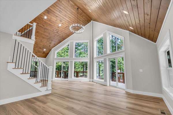 Inside, you'll be greeted by dramatic vaulted wood ceilings and expansive windows that flood the home with natural light, seamlessly connecting the indoors to the serene forest surroundings. Luxury LVP floors throughout, custom hickory hardwood cabinetry, granite countertops, and premium stainless steel appliances elevate the open-concept kitchen and living areas, perfect for both quiet evenings and elegant entertaining.