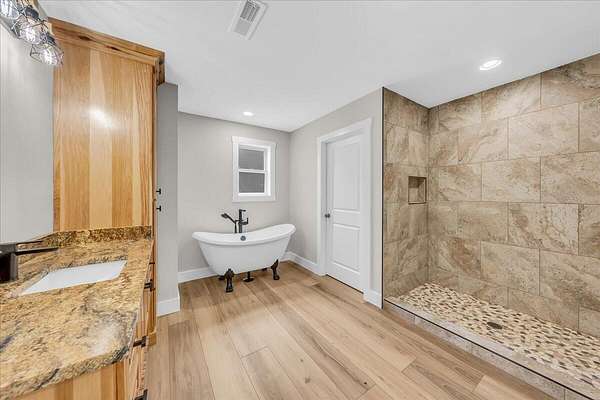 Inside, you'll be greeted by dramatic vaulted wood ceilings and expansive windows that flood the home with natural light, seamlessly connecting the indoors to the serene forest surroundings. Luxury LVP floors throughout, custom hickory hardwood cabinetry, granite countertops, and premium stainless steel appliances elevate the open-concept kitchen and living areas, perfect for both quiet evenings and elegant entertaining.