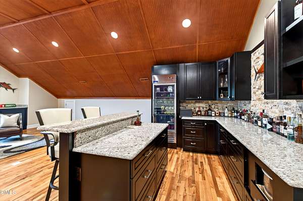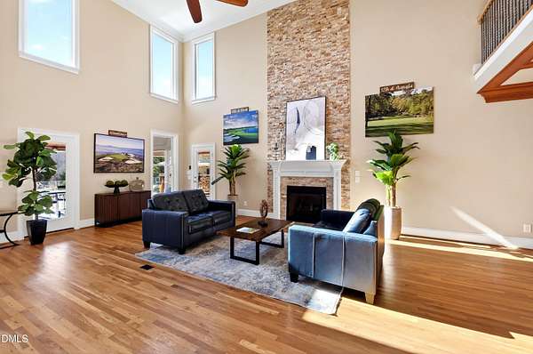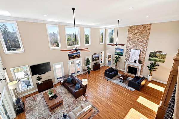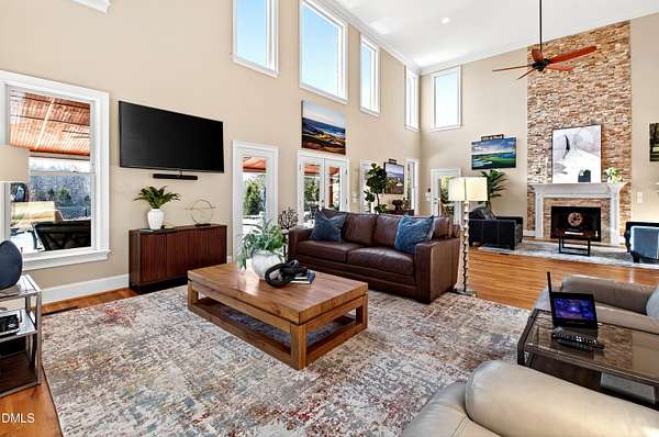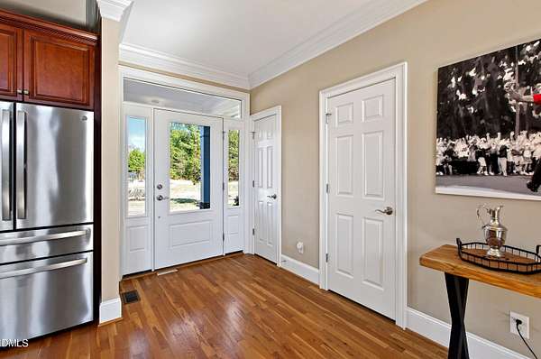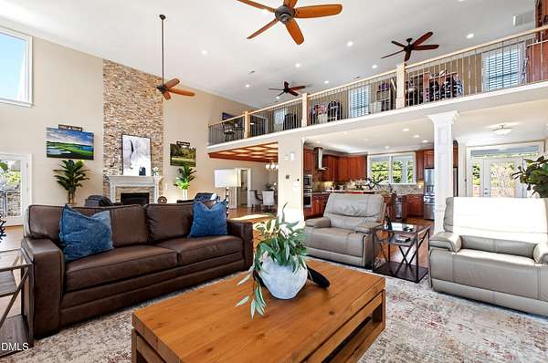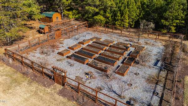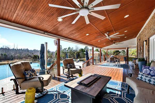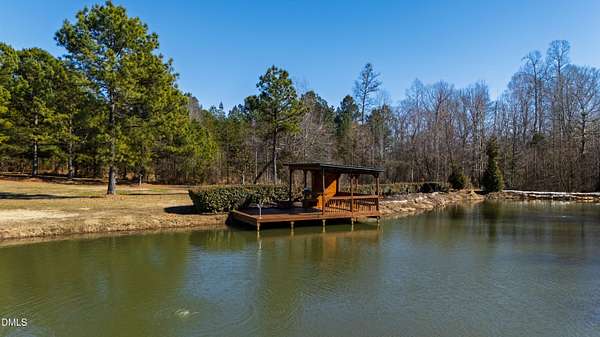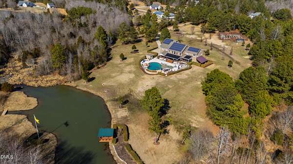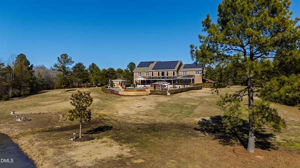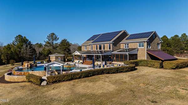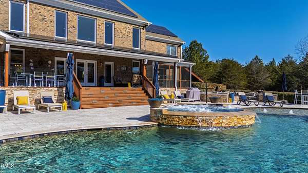 Set gracefully amidst 10 private acres in the heart of rural North Carolina, this exceptional country estate presents a rare offering where refined luxury and natural beauty exist in perfect harmony. Beyond the privately gated entrance, a winding approach framed by mature trees and curated landscaping creates a striking sense of arrival, setting the tone for the extraordinary residence that awaits. Designed with both elegance and livability in mind, the home offers four bedrooms and four-and-a-half baths, thoughtfully arranged within an open-concept floor plan that balances grand scale with warm, inviting spaces. An expansive family room anchored by a fireplace flows effortlessly into the main living areas, while abundant windows invite natural light indoors and frame tranquil views of the surrounding landscape and resort-inspired grounds. At the heart of the home, the chef's kitchen is beautifully appointed with premium appliances, an oversized island, and generous custom cabinetry, a space equally suited for intimate gatherings and elevated entertaining. The adjoining living spaces open naturally to the outdoors, enhancing the seamless connection between indoor comfort and outdoor splendor. The primary suite is a private sanctuary, featuring a coffered ceiling, direct access to the screened porch, and a spa-inspired bath designed for relaxation. An oversized dual head shower, soaking tub, and refined finishes create a retreat that feels both indulgent and serene. Upstairs, three spacious bedrooms provide privacy and comfort, complemented by a dedicated office, wet bar, and open loft ideal for entertaining or relaxed everyday living. The third level offers additional flexibility with a large game and media space, as well as a hidden room discreetly tucked behind a bookcase, an unexpected and charming detail. Outdoor living reaches resort-level distinction. An expansive deck accommodates both lounge and dining areas and is complemented by a fully equipped outdoor kitchen with gas grill, sink, ice maker, and beverage refrigeration. Beyond, the spectacular infinity edge pool creates a true private oasis, complete with a jump rock, sun shelf with bubblers, infinity spa, and a covered swim-up bar featuring built-in seating, hibachi grill, outdoor television, and additional refrigeration, an extraordinary setting designed for memorable gatherings. Additional outdoor amenities include a pool house with full bath and outdoor shower, a large horseshoe firepit, and a fully stocked fishing pond with covered dock and built-in seating. The grounds further enhance the estate lifestyle with flourishing gardens, raised beds, a glass greenhouse, fruit trees, berry patches, and a spacious fenced chicken coop, offering a rare blend of beauty and sustainability. Modern efficiencies complete the offering, including a 28kW solar system with remote monitoring, an electric vehicle charger, and a whole-house generator - thoughtful features that provide comfort and peace of mind. A property of exceptional character and distinction, this estate offers a lifestyle defined by privacy, sophistication, and effortless connection to the surrounding landscape. Do not miss the opportunity to make this exceptional estate your home.