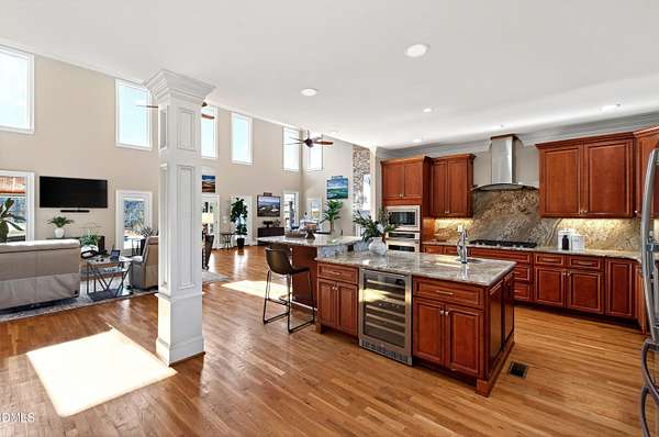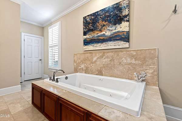 - Bar, Bathtub/Shower Combination, Ceiling Fan(s), Chandelier, Coffered Ceiling(s), Crown Molding, Double Vanity, Dry Bar, Entrance Foyer, Granite Counters, High Ceilings, Kitchen Island, Open Floorplan, Pantry, Primary Downstairs, Separate Shower, Shower Only, Smart Thermostat, Smooth Ceilings, Soaking Tub, Stone Counters, Walk-In Closet(s), Walk-In Shower, Water Closet, Wet Bar, Whirlpool Tub