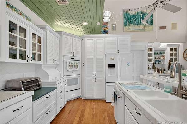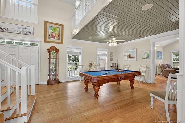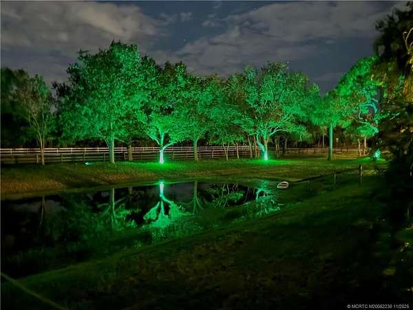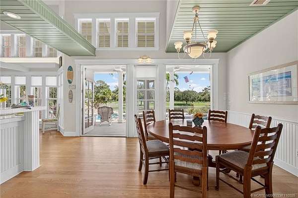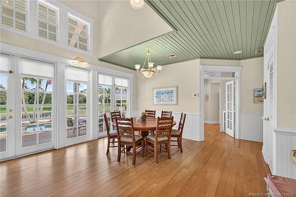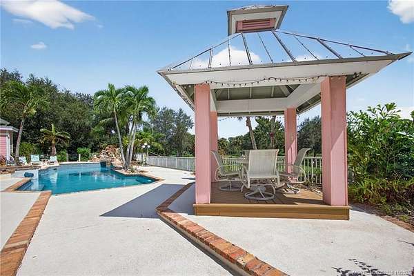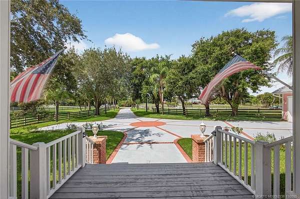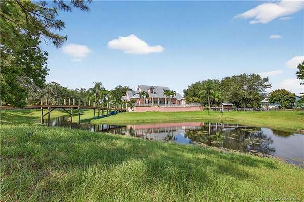 Every house has a story and this beloved farmhouse in Palm City has love and laughter in every chapter. The picturesque setting of 4.39 fully fenced acres, mature trees and a wooden bridge over a pond frequented by ducks, is the backdrop for this four-bedroom, four-bathroom home. Greet your guests from rocking chairs or a swing on the covered porch. Invite them into the large living room that can simultaneously host a game of billiards and a sing-along by the piano. Retreat into the family room for television or quiet time or wander into the open and airy country-kitchen for a quick bite or a savory meal. Dine al-fresco on the back porch overlooking the pool, spa & scenic waterfall or head upstairs to the loft, a perfect space for arts & crafts, fitness or a library. An over-sized two-car garage with TWO attached guest apartments, each with its own kitchen, completes the package. Partial impact glass. Close to horse trails yet easy access to town amenities. Chicken coop does not convey
