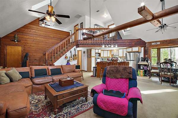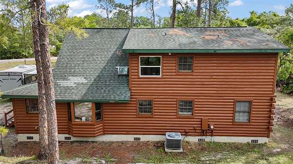 Ready to escape the hustle and bustle of city life and retreat to your own personal wooded paradise? Look no further! Situated on two acres, this property will transport you to the mountains while keeping you close enough enjoy everything Central Florida living has to offer including easy access to the 429! Bring your toys and rods because with RV parking, a pond, a gun range, and two acres to let your imagination run wild, you'll be hard pressed to duplicate all that this property has to offer. Upon pulling in the solar powered gate, your eye will immediately be drawn to the log cabin home with a screened in wrap around porch. Imagine sipping your morning coffee or evening cocktail while letting the sounds and sights of nature relax you. Upon entering the home, the vaulted ceiling, open concept, flood of natural sunlight, and spacious living area will have you excited to host large gatherings or enjoy the solitude without feeling cramped. The first floor also offers two spacious bedrooms and a full bathroom. The upstairs is a dedicated owners retreat complete with office area, bedroom, walk in closet, and full bath that offers both privacy and space away from the main living areas. Outside you'll be delighted to find a 20 x 20, 400sqft, well-kept shed perfect for tools, toys, and equipment. Looking to keep in-laws close? The second acre is able to be built on as well! Have peace of mind knowing this home has been well loved. Updates include: whole home replumbing (2025), fresh exterior paint (2025), new outdoor carpet on wrap around porch (2025), new screens and doors on porch (2025), all new insulation and vapor barrier in crawl space (2025), a newer roof, reverse osmosis well filtration, shed (2017), washer and dryer (2018), carpet (2019), HVAC (2019), refrigerator (2022), built-in oven (2017), disposal (2023), septic lift station pump (2023), cooktop (2023), new ceiling fans in the master and porch, and LVP flooring in the kitchen and dining area (2024). With hurricanes always top of mind, you can keep your cool knowing your new home is wired for a whole home generator. If all of this wasn't enough, the HOA also includes access to a park and playground off Wildflower Way and a private boat ramp to Lake Norris. The only thing this property is missing is you!