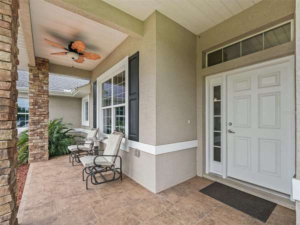 The home features 4 bedrooms and 2 bathrooms, with a thoughtfully designed floor plan. A long, elegant driveway leads you to the residence, where you'll be greeted by immaculate landscaping, stacked stone-accented columns, and a covered front porch with tile flooring, a ceiling fan, and a cozy sitting area--perfect for relaxing evenings.