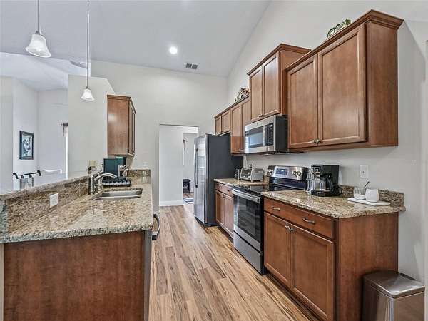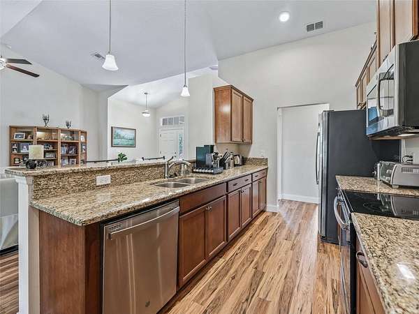 Inside, enjoy luxury vinyl and tile flooring throughout, granite countertops, and a chef's kitchen complete with a breakfast bar with pendant lighting, stainless steel appliances, eat-in nook, and a formal dining room or bonus sitting area.