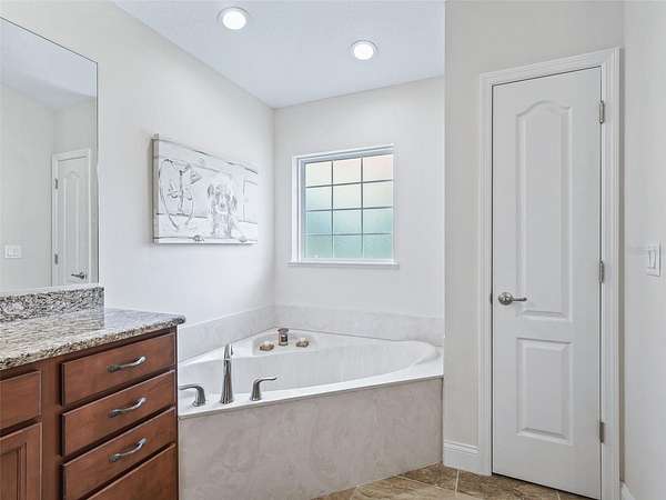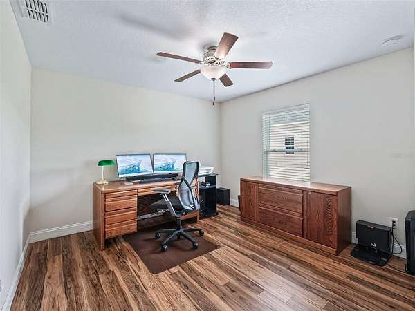 Three additional bedrooms and a full guest bathroom with a tub/shower combo and glass sliding doors offer plenty of space for family or guests.