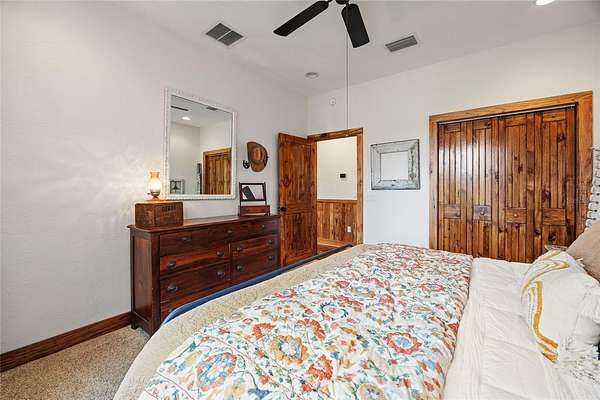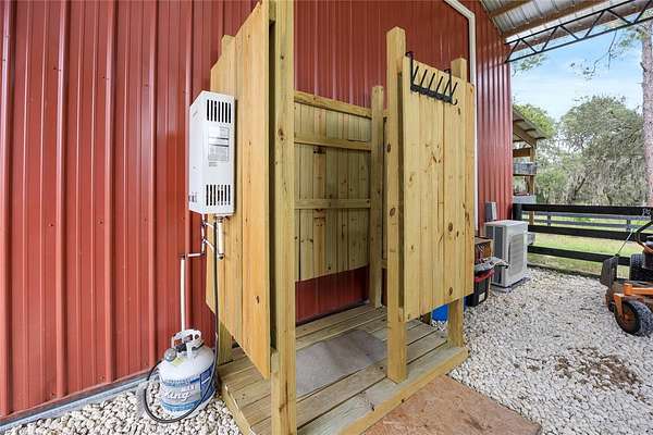 The fully insulated pole barn features A/C, heat, covered trailer parking, an outdoor shower, and a 50-amp RV hookup. Park your boat, RV, or horse trailer with ease. Open the large bay door for movie night overlooking the pasture--your horses included.
