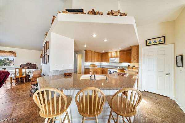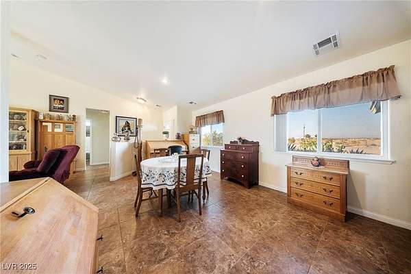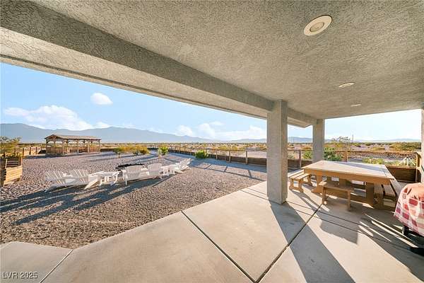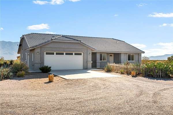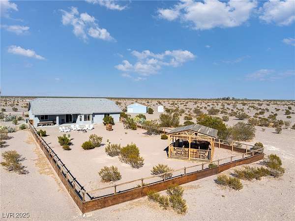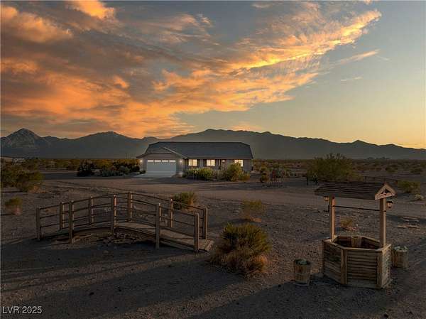 Welcome to your dream home in the serene Amargosa Valley on 9.52 acres! This beautifully maintained 3-bedroom, 2-bathroom home is ideal for those looking to escape city life or for investors seeking rental opportunities. Inside, you'll find vaulted ceilings in the spacious formal living and family rooms, along with tile flooring throughout. The gourmet kitchen boasts picturesque mountain views, an island bar, and a walk-in pantry. The primary bedroom features sliding doors leading to the outside and a luxurious en-suite bathroom with a garden tub, walk-in shower, double-sink vanity, and a spacious walk-in closet. Enjoy outdoor living on the covered patio or in the gazebo with swings. Explore the versatile 23 x 31 workshop, perfect for hobbies or potential rental conversion, plus full RV hookups. Located minutes from outdoor attractions like Big Dunes, Ash Meadows, and Death Valley, this hidden gem offers endless possibilities. Don't miss out on this incredible opportunity!