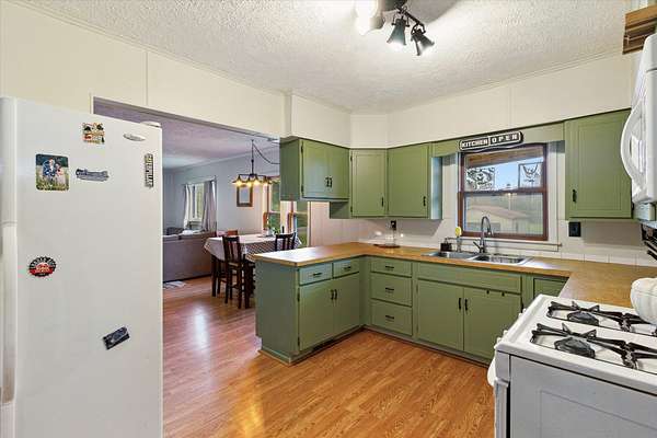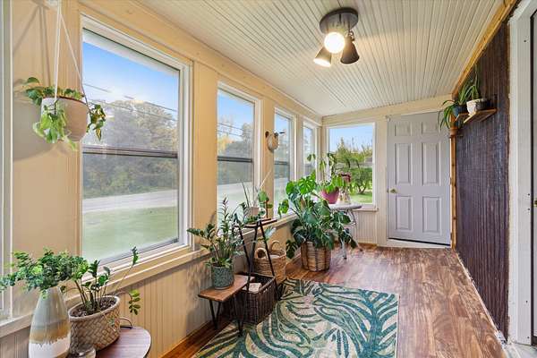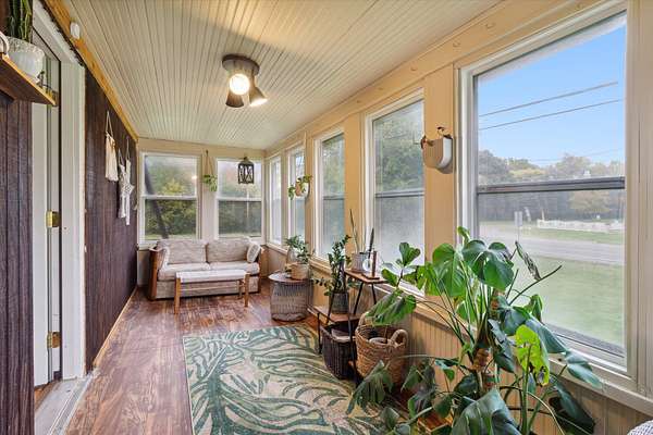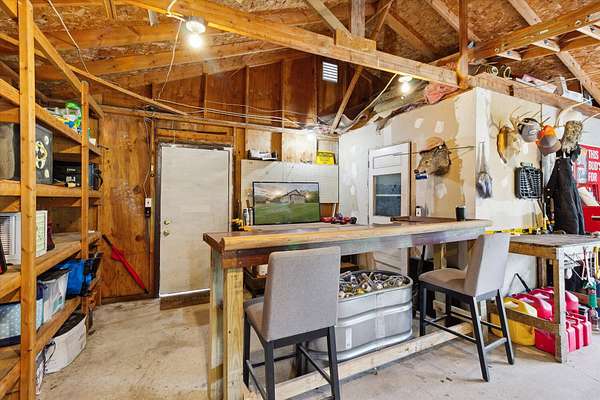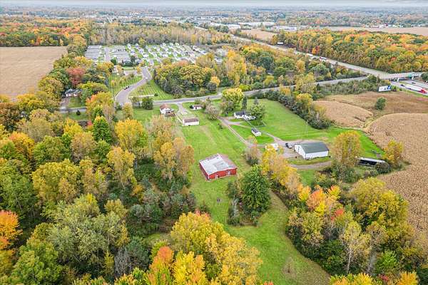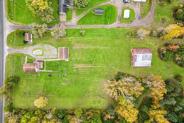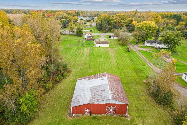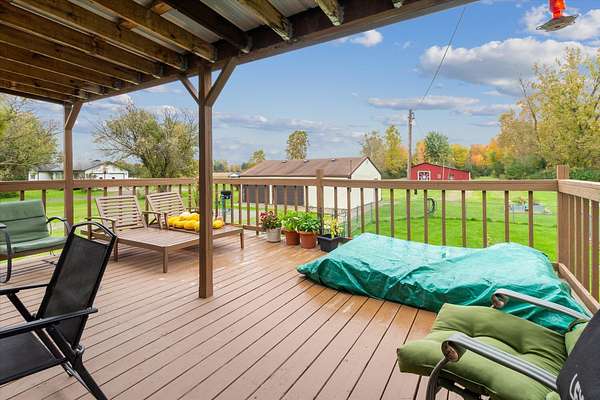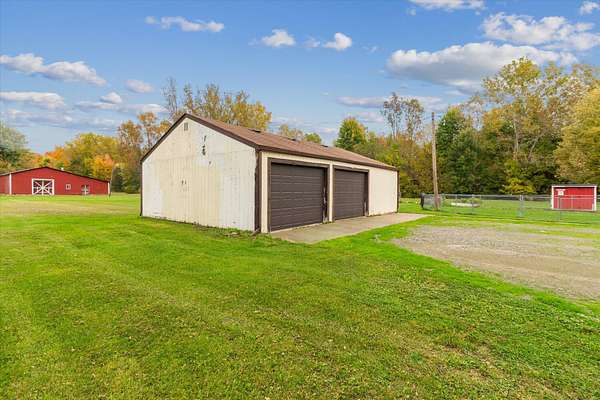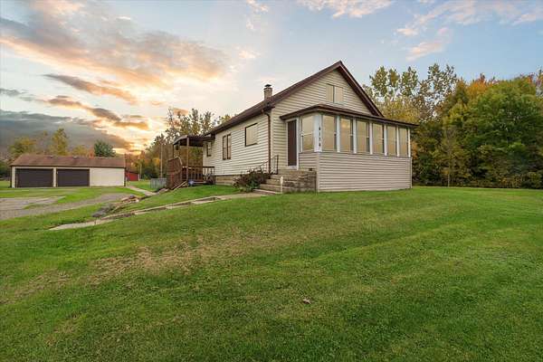 Charming bungalow on over 10 acres of land is not only a parklike setting but a sportsman's paradise along with walking trails. Three large outbuildings include the 52x52 pole barn with 12' height clearance and 5 stalls. Both the 26x36 and 16x28 garages have a concrete approach and 8' high doors. The large partially covered deck is elevated and is great for grilling out and viewing wildlife like deer, turkey, red and gray fox. Inside you'll find an open floor plan with a bedroom on the main floor and large full bath with double vanity. Reap the benefits of abundant sunshine in the enclosed covered porch with full southern exposure. Perfect for your house plants or get a jump start on your garden. The upper level hosts an 18x11 bedroom with an 8x11 bonus space. The walkout basement is just under 800 sq. feet and leads to the fenced portion of backyard. Home is wired for a generator.