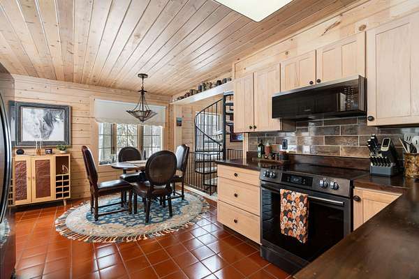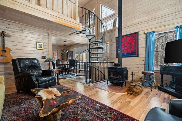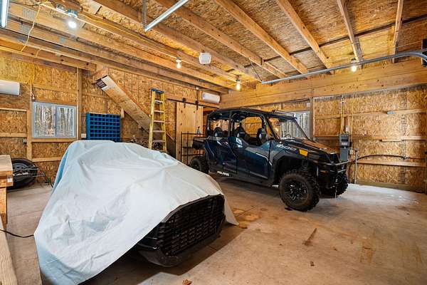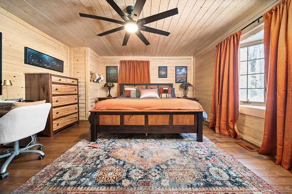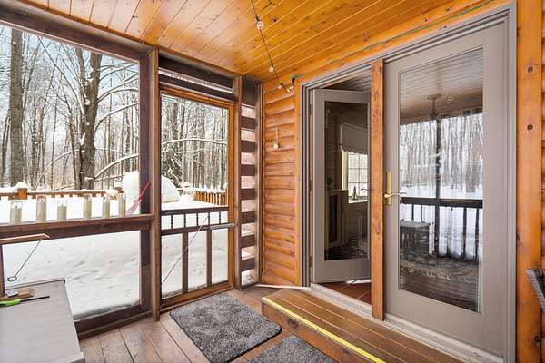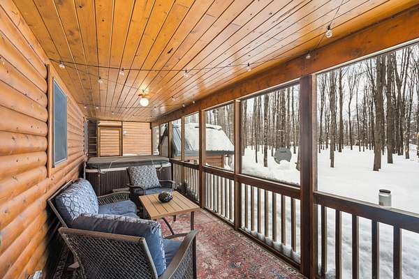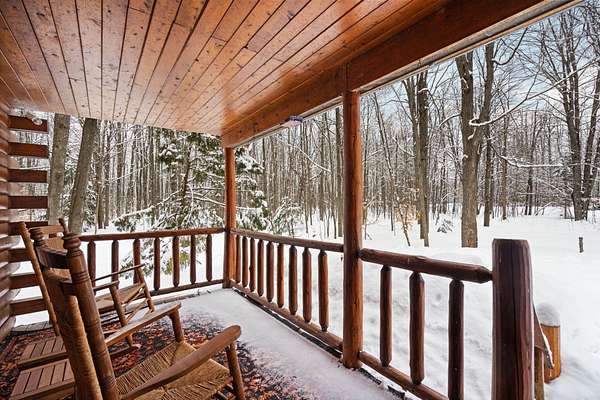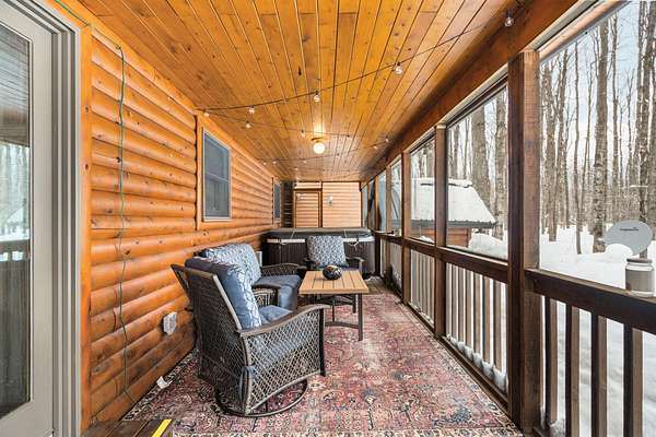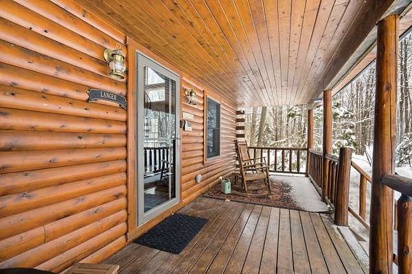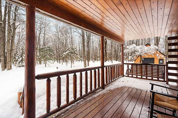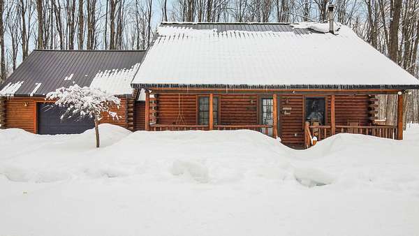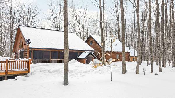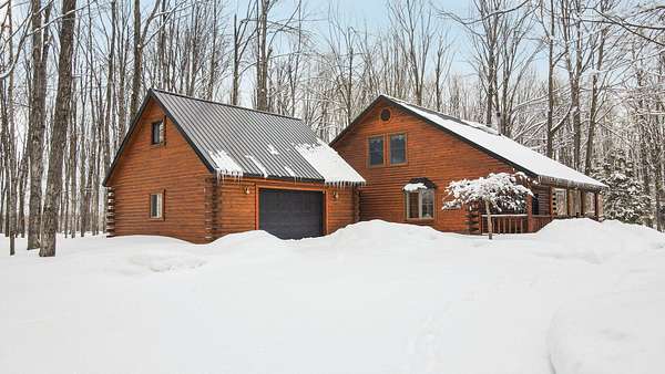 Beautifully maintained log home in Lakes of the North! Offered fully furnished, this 3-bed, 2.5-bath home encompasses 6 acres, imbibing the outdoors with a traditional covered front porch, screened in back porch and deck that reaches into the forest. Cedar tongue and groove, hardwood flooring and a decorative wood burning stove emit a rustic, yet refined space while the remodeled, walk-out basement adds additional living, sleeping and recreational space. Storage is abundant with two detached 24x24 garages, one with mini-split units for climate control, plus upper storage in both. Main-level primary suite, brand new steel roof and geo-thermal heat. Enjoy the amenities Lakes of the North offers including access to Pencil Lake, Lake Harold, indoor water park and near snowmobile trails.