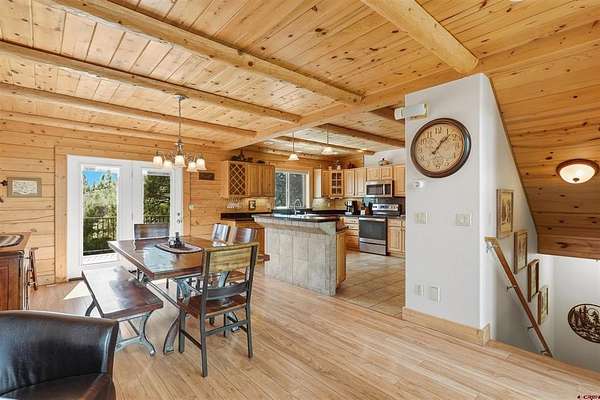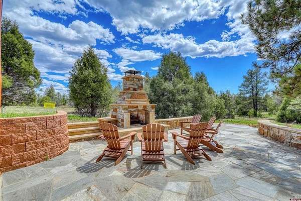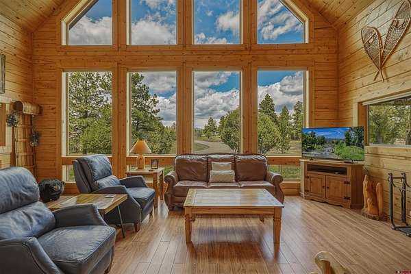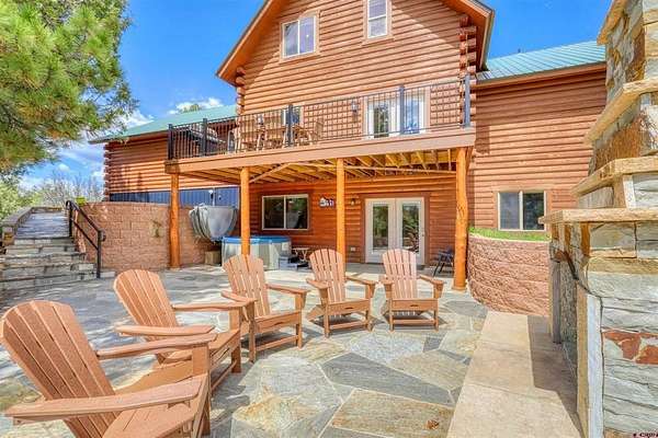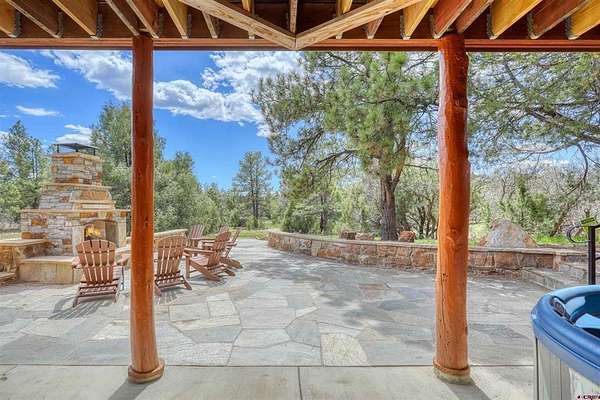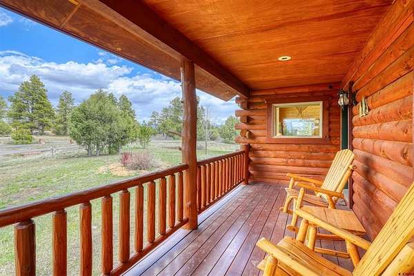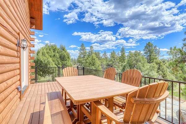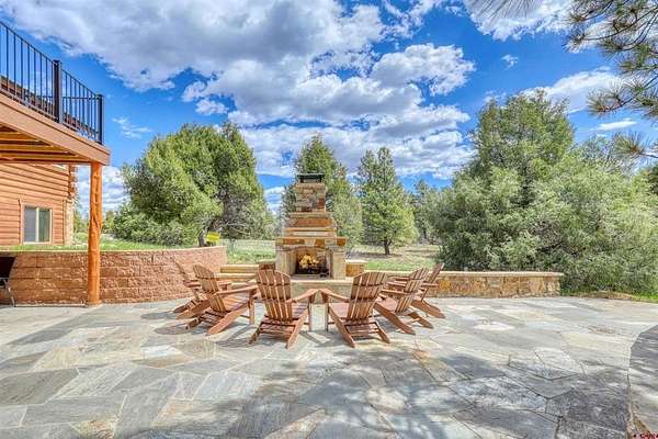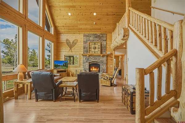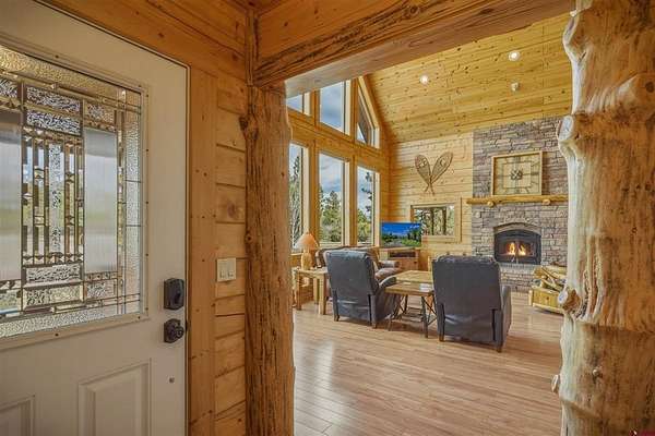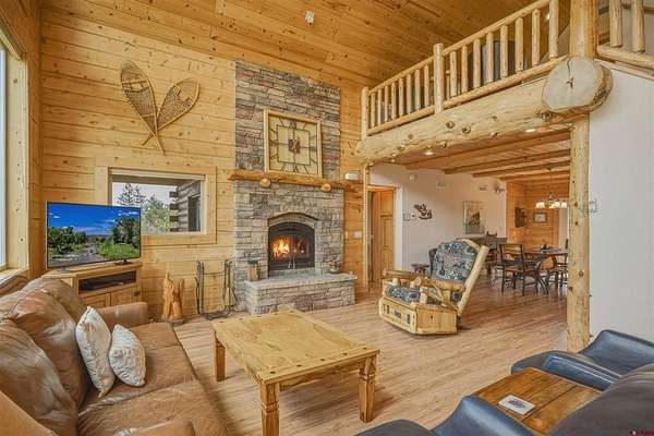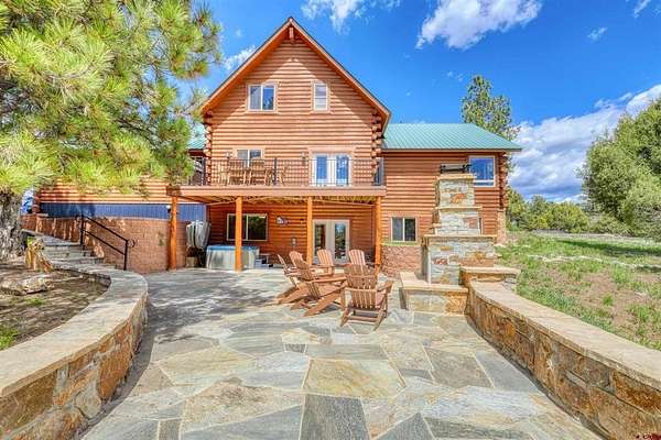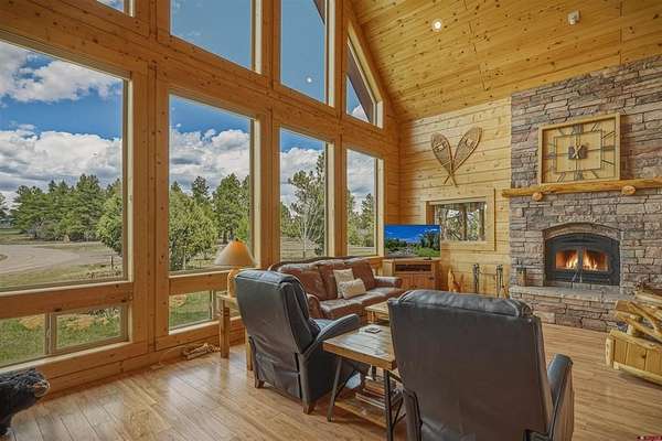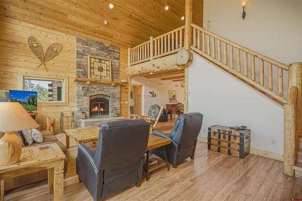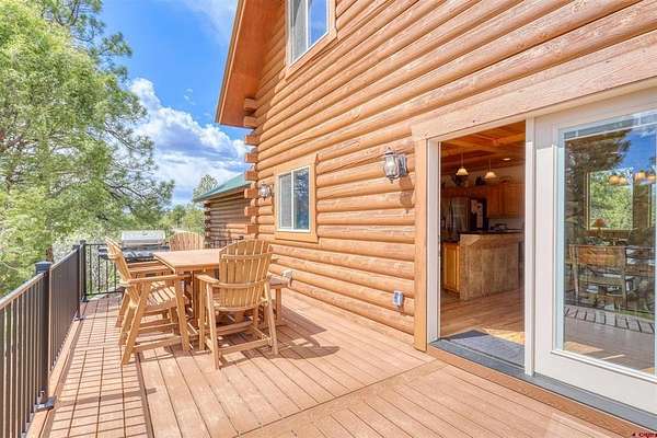 Diane Burnett, Galles Properties, C: 970-749-4303, diane@gallesproperties.com, www.gallesproperties.com: Experience the best of Pagosa Springs mountain living in this custom D-log home, ideally situated on a private 3-acre lot in the highly sought-after Timber Ridge community. Offered fully furnished, this beautifully crafted home blends rustic elegance with modern comfort, set among peaceful meadows and pines. Located on a paved road with city water and sewer, this 4 bedroom, 3.5 bath home is super convenient to downtown, medical facilities, shopping, and dining, all while maintaining a sense of privacy and seclusion. Inside, the home features soaring pine vaulted ceilings and walls on the main and upper levels, expansive floor-to-ceiling windows that fill the space with natural light, log accents , and a floor-to-ceiling wood-burning stone fireplace that creates a warm and inviting main living area. The open floor plan flows seamlessly into a spacious, fully equipped kitchen with center island, ample storage and upgraded granite countertops.The main-level primary suite offers both comfort and convenience, complete with an ensuite bath and a private covered deck to soak in the mountain views. A second covered deck is located off the main living area at the entrance, while a newly Trex-covered back deck extends from the dining room and kitchen, overlooking the forest and a beautifully designed patio. The backyard features a custom Craftsman-style stone patio with a gas fireplace, creating an ideal space for outdoor entertaining or relaxing beneath Pagosa Springs’ renowned dark skies...perfect for star gazing. This thoughtfully designed home includes three levels, each with its own living or sitting area, providing ample space for family and guests. The upper level offers a loft great for an office or sitting area, a separate bedroom along with a Jack-and-Jill bathroom. The lower level functions as a private apartment-style retreat featuring high ceilings, a wet bar, two large bedrooms, bath, another washer/dryer set and a spacious secondary living area ideal for a family room, TV space, or game room. Comfort is ensured year-round with in-floor radiant heating on the main and upper levels, along with a mini-split air conditioning system for added cooling. Additional features include a private hot tub on the back patio, low-maintenance natural landscaping, and a Rain Bird app-controlled drip irrigation system that services trees and flower beds. Hike from the house on the extensive trail system weaving through the community. This exceptional Timber Ridge property offers a rare combination of privacy, quality craftsmanship, and convenient access to everything Pagosa Springs has to offer, making it ideal as a full-time residence, vacation home, or investment opportunity.
