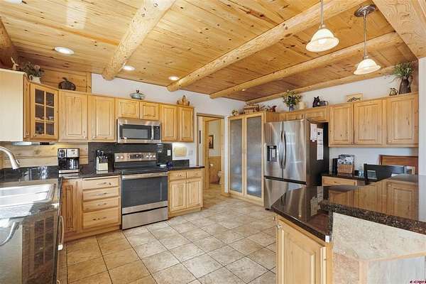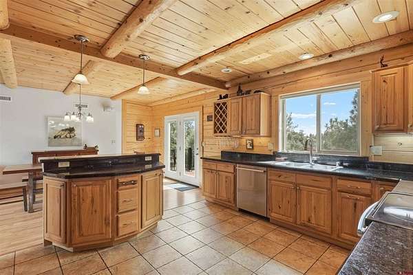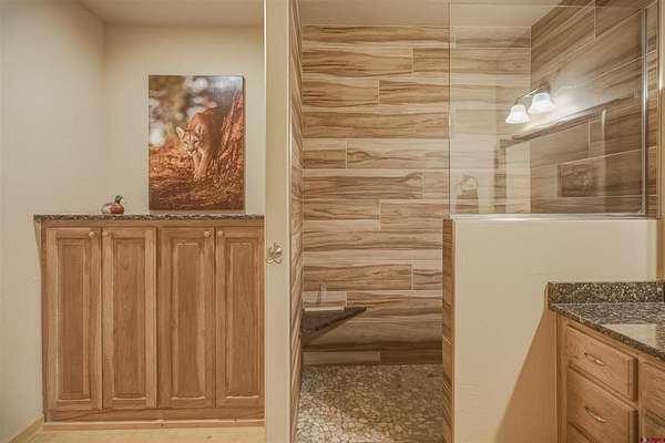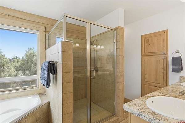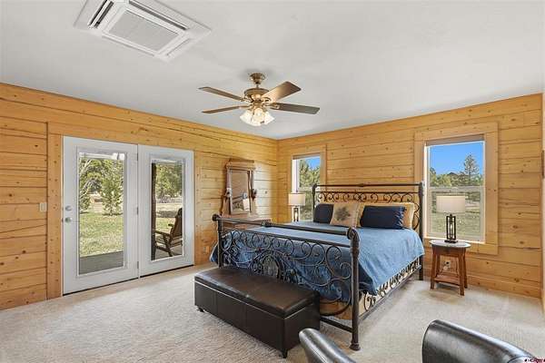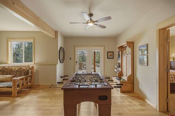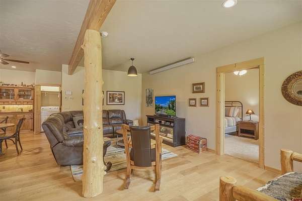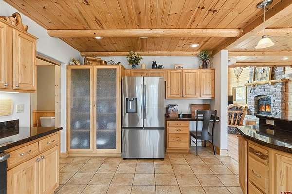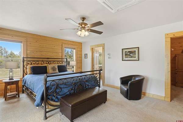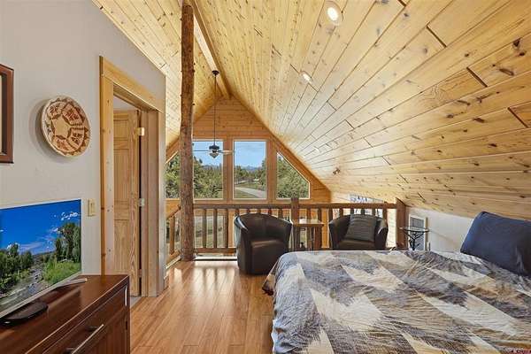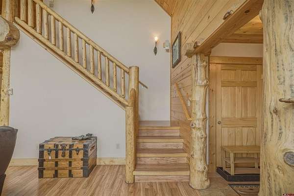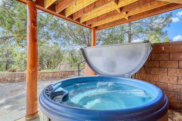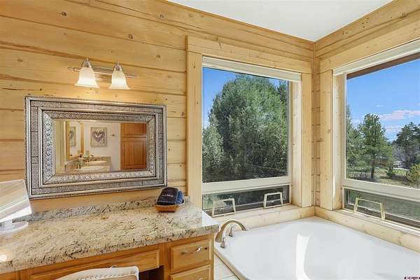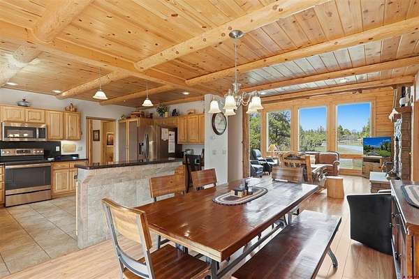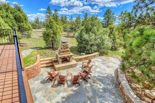 Diane Burnett, Galles Properties, C: 970-749-4303, diane@gallesproperties.com, www.gallesproperties.com: Experience the best of Pagosa Springs mountain living in this custom D-log home, ideally situated on a private 3-acre lot in the highly sought-after Timber Ridge community. Offered fully furnished, this beautifully crafted home blends rustic elegance with modern comfort, set among peaceful meadows and pines. Located on a paved road with city water and sewer, this 4 bedroom, 3.5 bath home is super convenient to downtown, medical facilities, shopping, and dining, all while maintaining a sense of privacy and seclusion. Inside, the home features soaring pine vaulted ceilings and walls on the main and upper levels, expansive floor-to-ceiling windows that fill the space with natural light, log accents , and a floor-to-ceiling wood-burning stone fireplace that creates a warm and inviting main living area. The open floor plan flows seamlessly into a spacious, fully equipped kitchen with center island, ample storage and upgraded granite countertops.The main-level primary suite offers both comfort and convenience, complete with an ensuite bath and a private covered deck to soak in the mountain views. A second covered deck is located off the main living area at the entrance, while a newly Trex-covered back deck extends from the dining room and kitchen, overlooking the forest and a beautifully designed patio. The backyard features a custom Craftsman-style stone patio with a gas fireplace, creating an ideal space for outdoor entertaining or relaxing beneath Pagosa Springs’ renowned dark skies...perfect for star gazing. This thoughtfully designed home includes three levels, each with its own living or sitting area, providing ample space for family and guests. The upper level offers a loft great for an office or sitting area, a separate bedroom along with a Jack-and-Jill bathroom. The lower level functions as a private apartment-style retreat featuring high ceilings, a wet bar, two large bedrooms, bath, another washer/dryer set and a spacious secondary living area ideal for a family room, TV space, or game room. Comfort is ensured year-round with in-floor radiant heating on the main and upper levels, along with a mini-split air conditioning system for added cooling. Additional features include a private hot tub on the back patio, low-maintenance natural landscaping, and a Rain Bird app-controlled drip irrigation system that services trees and flower beds. Hike from the house on the extensive trail system weaving through the community. This exceptional Timber Ridge property offers a rare combination of privacy, quality craftsmanship, and convenient access to everything Pagosa Springs has to offer, making it ideal as a full-time residence, vacation home, or investment opportunity.
