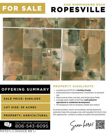 Located just off FM 41, this 35-acre property in Hockley County presents a unique opportunity for development, investment, or personal use. Whether you're a developer seeking the ideal location for a new subdivision, an investor looking for a strategic land acquisition, or an individual in search of farmland, ranch land, or the perfect homesite, this property offers endless possibilities. The landscape is adorned with mature pecan trees, adding charm and character, while lush wheatgrass fields provide excellent grazing or farming potential. With one 10 horsepower well and an average water depth of 120 - 160 feet, the land is well-suited for sustainable agricultural or residential development. Its prime location, scenic surroundings, and development potential make this acreage a rare and valuable find. Don't miss this opportunity-contact us today to explore the possibilities!