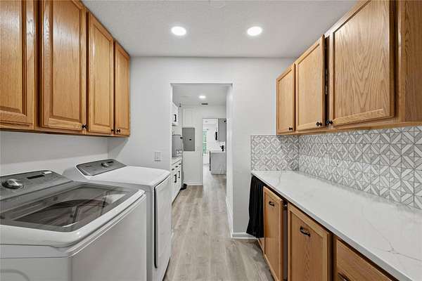 - Ceiling Fans(s), Eat-In Kitchen, Kitchen/Family Room Combo, Living Room/Dining Room Combo, Open Floorplan, Solid Surface Counters, Solid Wood Cabinets, Split Bedroom, Stone Counters, Thermostat, Walk-In Closet(s)