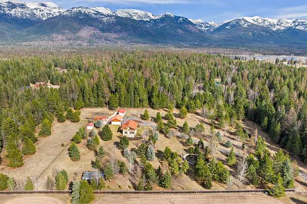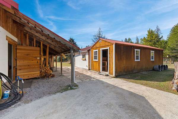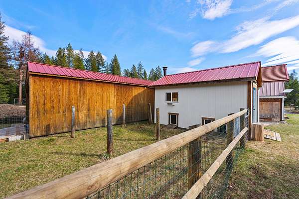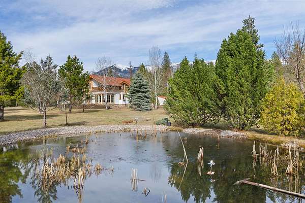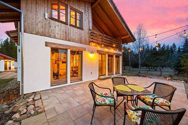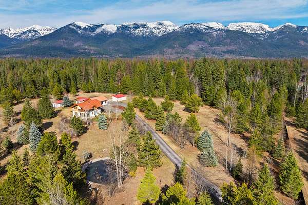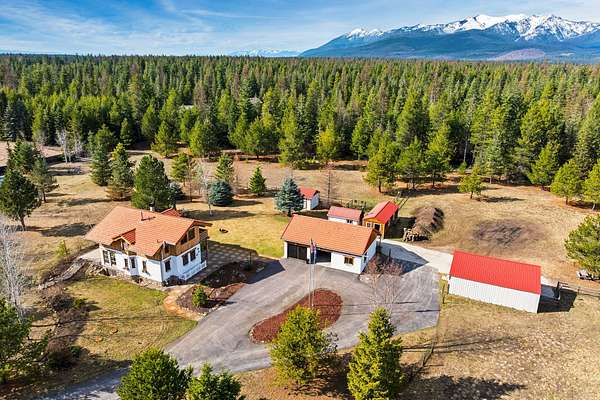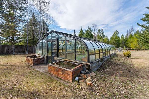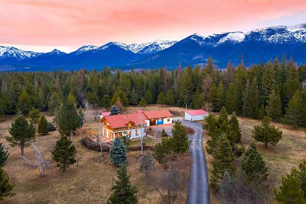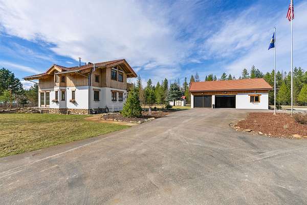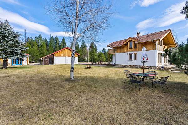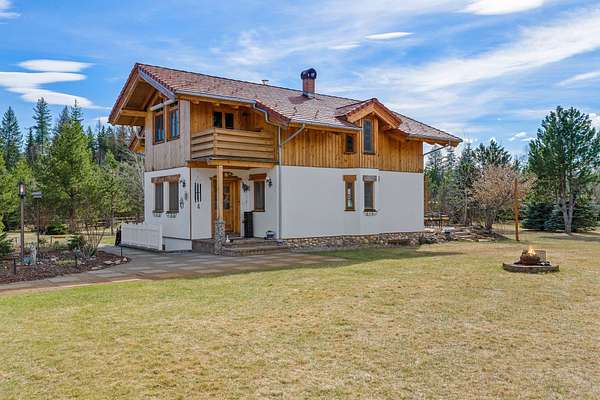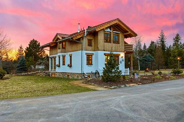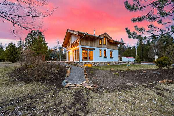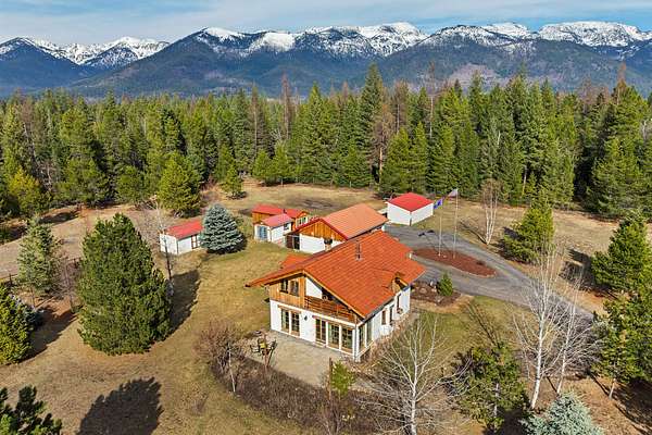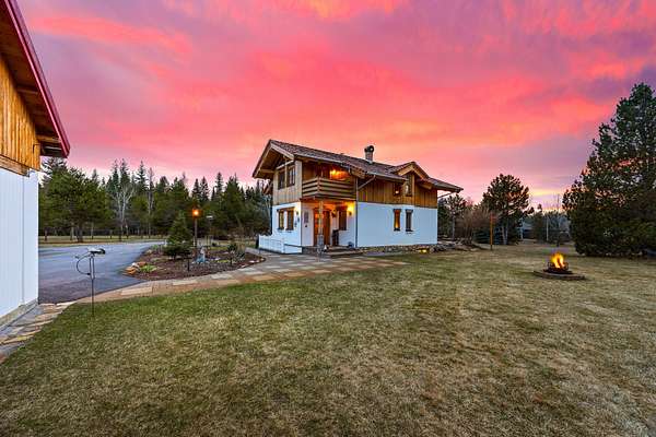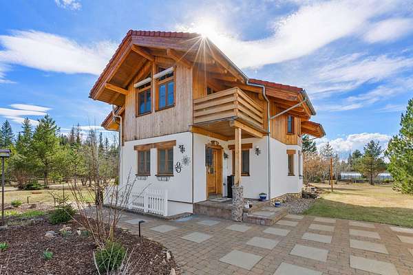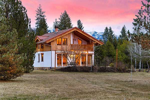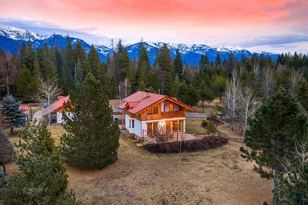 Where European craftsmanship meets Montana mountains, this Bavarian German-built chalet offers a rare combination of precision, durability, and quiet beauty. Set on 5+ private, fully fenced and gated acres, the property is positioned to capture stunning views of the Swan Mountain Range and is thoughtfully designed to offer moments of peace, quiet, and true tranquility. The chalet is constructed with poured concrete foundations and a durable tile roof, an intentional approach to longevity and structural integrity. Inside, the layout is open and efficient, defined by exposed timber beams, vaulted ceilings, and a traditional European masonry fireplace that serves as the central focal point of the living space. The upper level is dedicated to the primary suite, offering a private balcony and a well-appointed bath complete with a cedar-lined sauna. The design emphasizes both function and comfort, creating a quiet, private retreat. The lower level features a private studio space with its own kitchenette and a wood-burning cookstove, providing flexible use for guests, extended living, or workspace. The grounds are thoughtfully developed for both utility and sustainability. A stone-lined pond is fed by a custom gutter system. The greenhouse, with raised beds and established plantings, is well-suited for year-round cultivation. Outbuildings are substantial and purpose-driven, including a detached garage and shop with lean-to storage, a large workshop shed, and a separate hobby structure. A root cellar is located within the home, adding practical, year-round storage. Modern systems include fiber internet to the home and a wired generator setup to ensure reliable, efficient living in all seasons. Some furnishings are being offered with the purchase, creating an opportunity for a more seamless transition into this well-appointed mountain retreat. This is a property defined by craftsmanship, order, and lasting quality, designed to function as well as it endures.