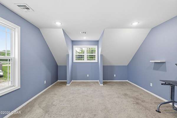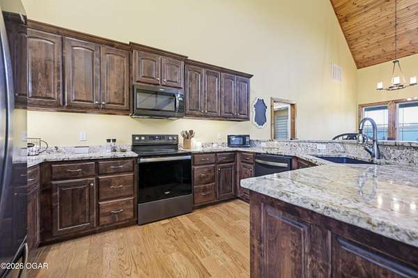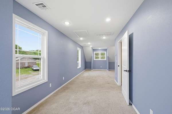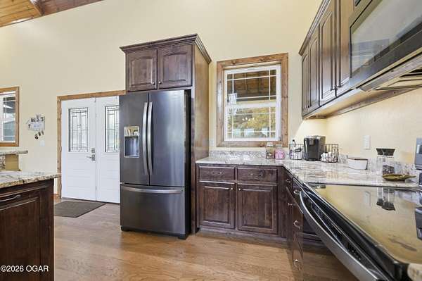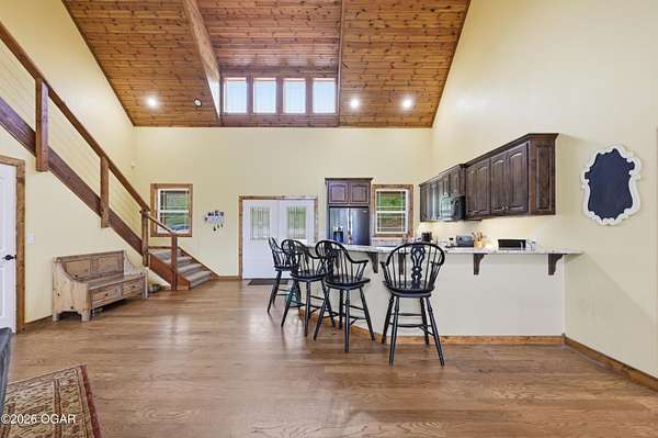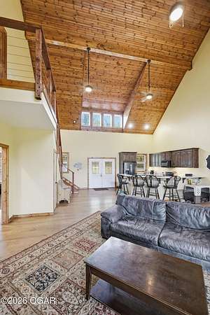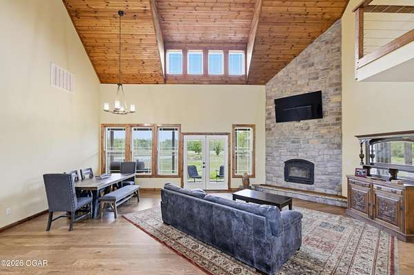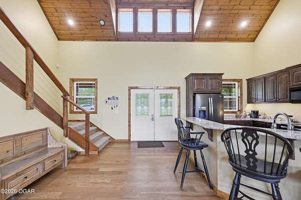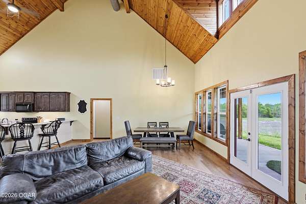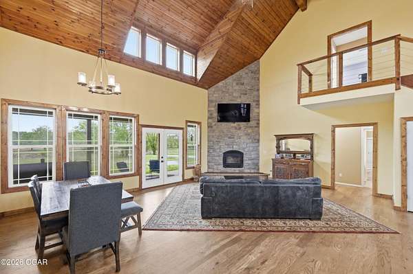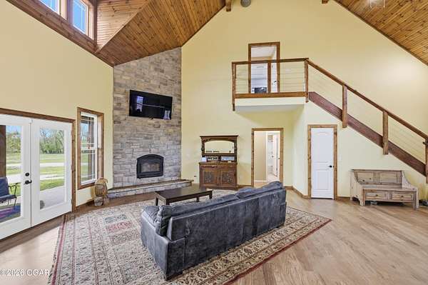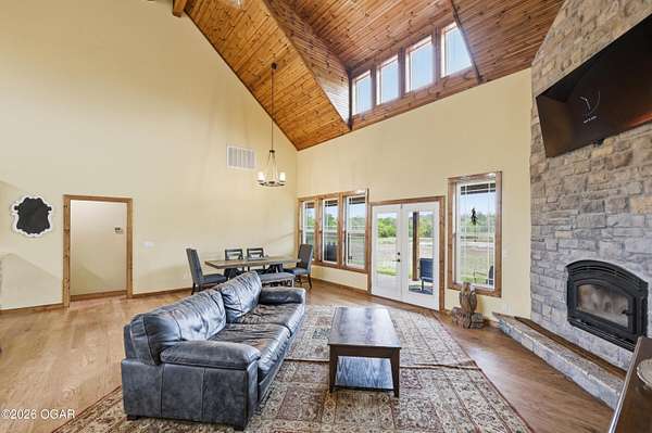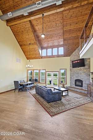 Built in 2021, this stunning barndominium offers the perfect blend of modern comfort and rustic charm situated on 6.51 beautiful acres with a durable metal roof and siding. Featuring approximately 2,700 sq ft of living space plus an additional 150+ sq ft of unfinished attic space, this home provides room to grow and flexibility for future expansion. The thoughtfully designed split floor plan includes 4 bedrooms and 3 full baths, centered around a spacious open-concept living, dining and kitchen area-ideal for both everyday living and entertaining. The kitchen offers an eat-at bar and flows seamlessly into the main living space, highlighted by abundant natural light from numerous windows overlooking the pond and surrounding acreage. Interior finishes include hardwood flooring throughout the main living areas and hallways, tile in bathrooms, and carpeted bedrooms for added comfort. The private suite features a generous walk-in closet, dual vanities, jetted tub, and a separate walk-in shower. Efficiency and comfort are top of mind with three HVAC units (dual fuel) and two hot water heaters. Enjoy peaceful views from the back covered porch, making this home the perfect retreat with modern conveniences and plenty of space to roam. Taxes to be determined off parcels to be purchased. Also listed on MLS 262002 & 262008