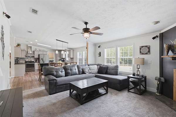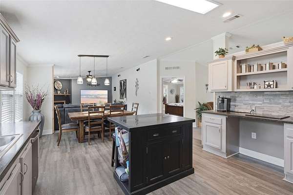 - Ceiling Fans(s), Eat-In Kitchen, High Ceilings, Kitchen/Family Room Combo, Primary Bedroom Main Floor, Solid Surface Counters, Solid Wood Cabinets, Split Bedroom, Stone Counters, Thermostat, Walk-In Closet(s), Window Treatments