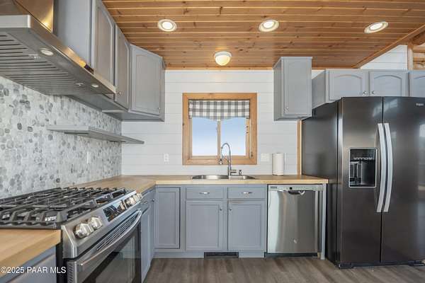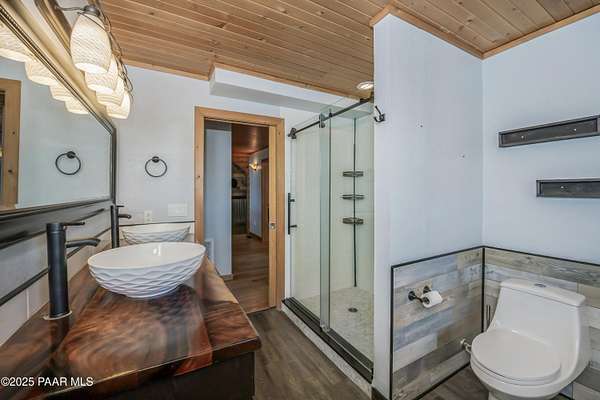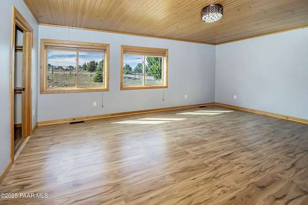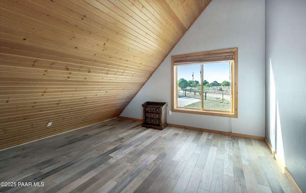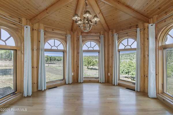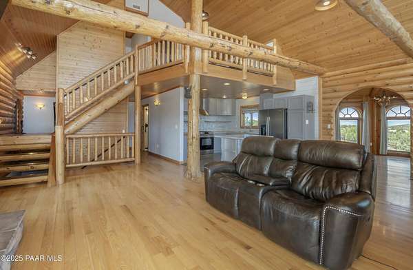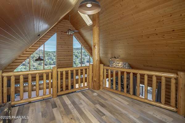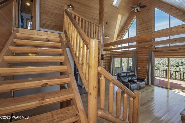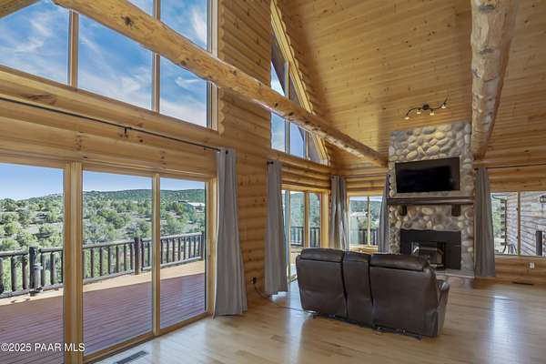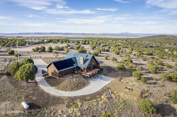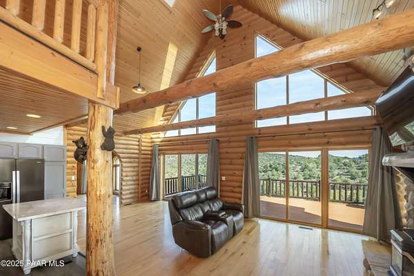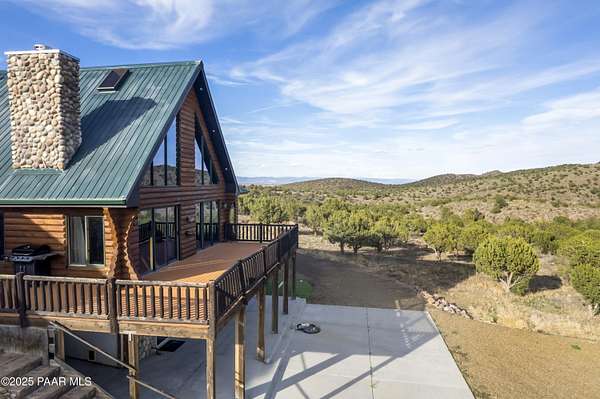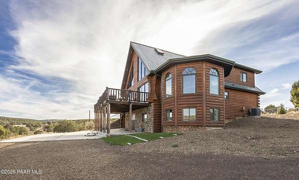 CUSTOM LOG Home with 3204 Square Feet of Quality Finishes on a Private/Fenced/Treed 2.5 Acre VIEW Lot NW of Chino Valley in Cedar Heights Subdivision with a total of 3 Bedrooms/3Bathrooms & Oversized 2Car Garage plus a possible 4th Bedroom!!!! This ''Mountain Setting'' has great Curb Appeal with River Stone Accents, Green Steel Roof, High Vaulted Ceilings with Trapezoid Windows looking over a Huge Redwood Deck, T&G Knotty Pine Lid, GREAT ROOM concept, Ceiling Fans, Pellet Stove w/Stone Chimney face & Wood Mantel, Peeled Pole accents, Log Staircase, Solar Tubes, Horizontal Blinds, & Beautiful Hardwood Oak Flooring. Kitchen has Painted Oak Cabinetry, Butcher Block Countertop, Stone Backsplash, Island with Granite Ctr Top, Stainless-Steel Appliances, Inc. Fridge. Primary Bedroom is Spacious on Main Floor with Large Walk-in Closet, Large Shower, Dual Vessel Sinks on Polished Wood Countertop. Other amenities include Formal Dining, 2 Large Bedrooms on upper level, Lower level has covered patio under Deck, Open paver Office/Den, large Game Room, Family Room, Kitchenette, Large Laundry w/Samsung front load Washer/Dryer, & that possible 4th Bedroom.