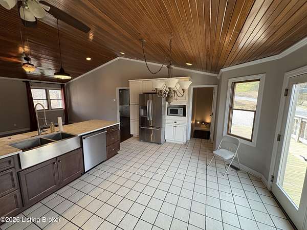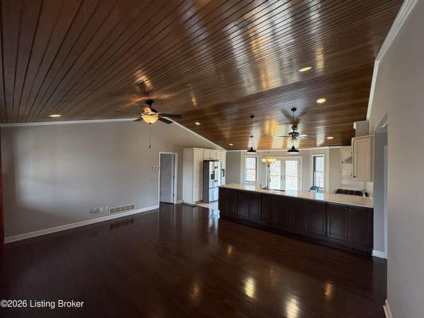 Est $2,856/moBeautiful 4-bedroom, 3-bath home on 14.75 acres offering space and privacy. Open-concept kitchen and living room feature hardwood floors, matching tongue-and-groove ceiling, and plenty of cabinet space. Finished basement provides extra living or entertaining area. Enjoy peaceful views from the wrap-around porch. Detached garage offers additional storage or workshop space. Perfect blend of comfort, charm, and country living.