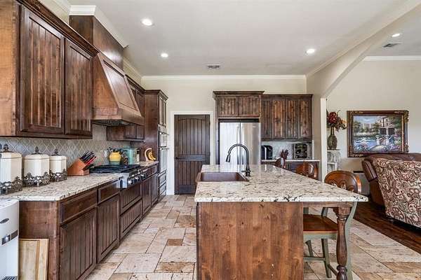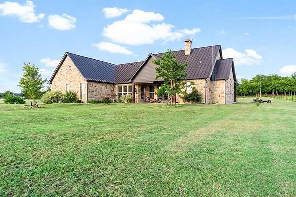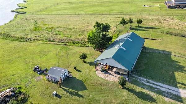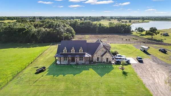 This stunning gated lakefront estate is situated on 3.6 acres in the highly desirable Rockwall ISD, offering a rare opportunity to own a one-of-a-kind ranch-style stone home with a fully equipped barndominium and horse facilities. Discover the perfect blend of luxury, privacy, and country living just minutes from downtown Rockwall and I-30. Step through custom wrought-iron double doors into an interior rich with charm and craftsmanship--featuring hand-scraped hardwood floors, travertine stone tile & a full masonry fireplace perfect for cozy winter nights.