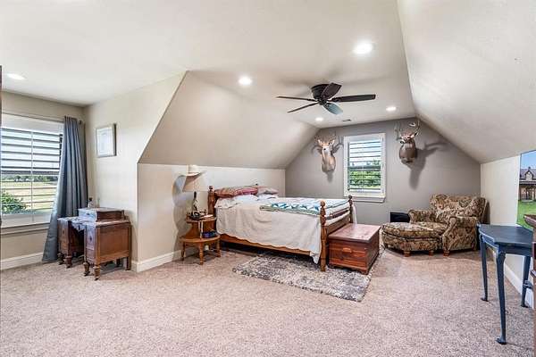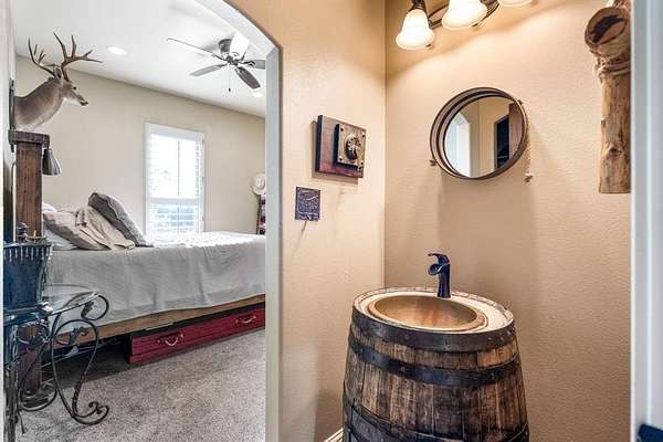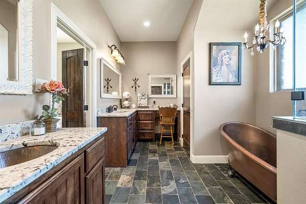 The luxurious primary suite boasts an oversized walk-in closet with direct access to the laundry room, a spa-inspired bathroom with a slate walk-in shower & a copper clawfoot tub. Two additional downstairs bedrooms share a stylish Jack-and-Jill bath with custom whiskey barrel sinks & large walk-in closets. Upstairs, you'll find a spacious second master suite or potential game room,media room with a private full bath & walk-in closet.