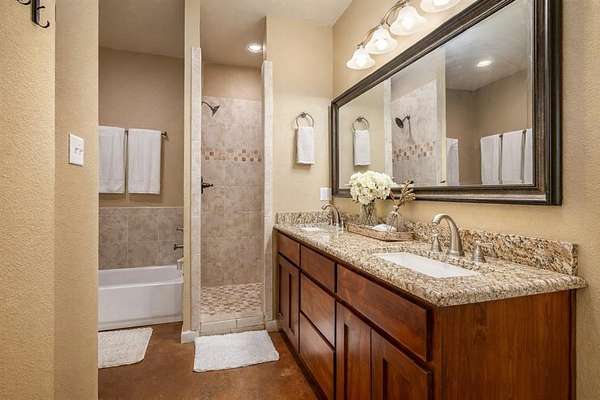 Inside, stylish concrete flooring and gleaming granite countertops enhance the expansive living spaces, ideal for both everyday living and upscale entertaining. The luxurious primary suite offers a spa-inspired bath, while two secondary bedrooms are thoughtfully connected by a Jack-and-Jill bathroom, providing both convenience and privacy.