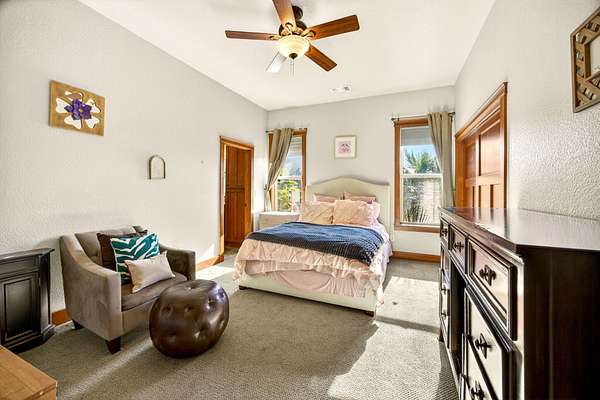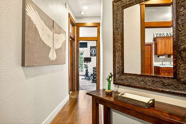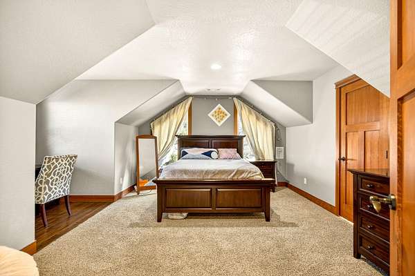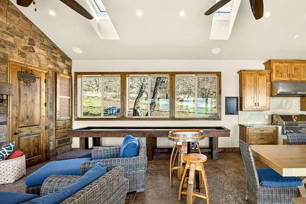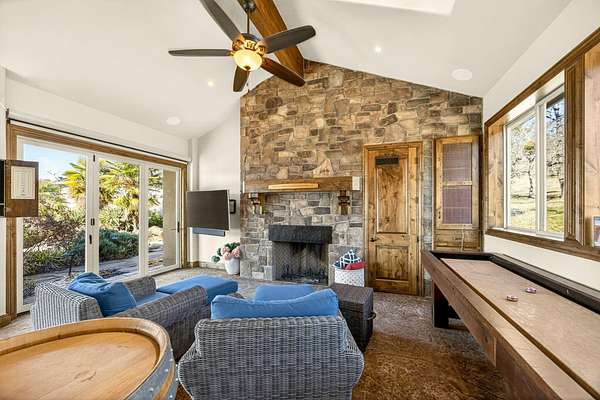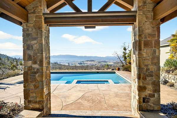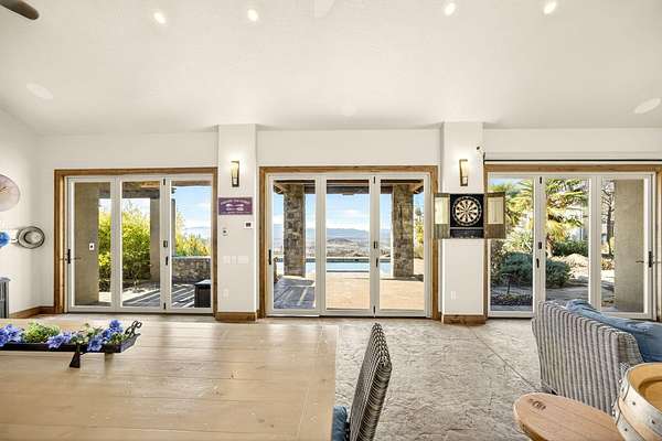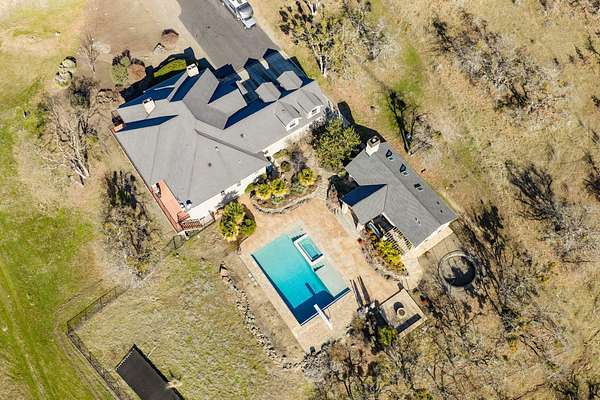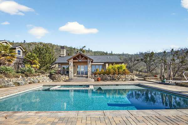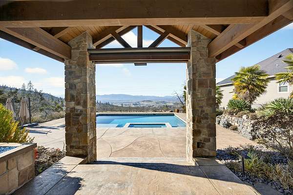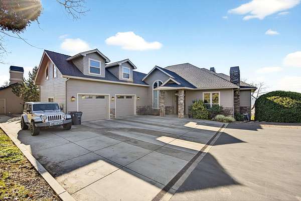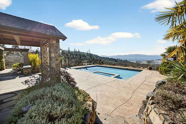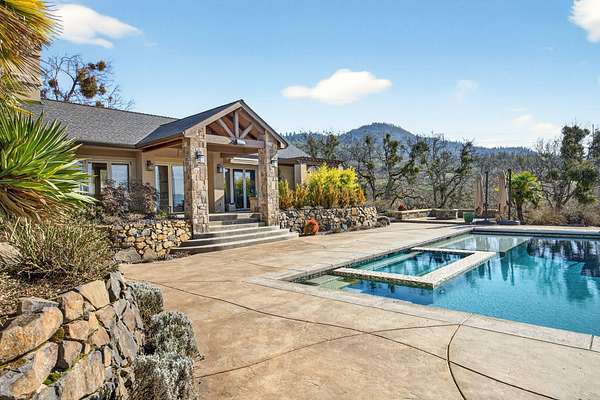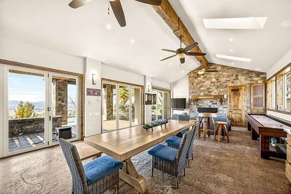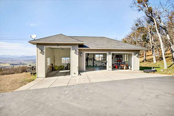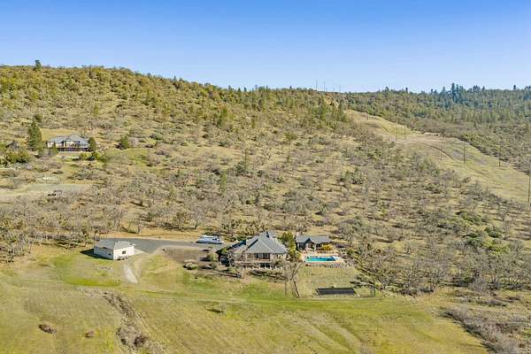 Exceptional home on nearly 10 private acres featuring panoramic valley and Table Rock views just outside E. Medford. Vaulted ceilings, a gourmet kitchen, and resort-caliber outdoor living define this one-of-a-kind property. The home offers hardwood floors, formal dining, and a private office with fireplace. The gourmet kitchen and family room feature a floor-to-ceiling rock fireplace, Wolf double ovens, a Sub-Zero refrigerator, and double doors open to an expansive patio. The main-level primary includes a soaking tub, walk-in shower, dual sinks, and custom closet. Two additional main-level ensuite bedrooms, a half bath, and a large laundry room complete the main level. Upstairs guest suite includes bedroom, bath, and living. Outdoor living offers a solar-heated pool and hot tub, patio, fire pit, and pool house with heated floors, BBQ kitchen, bath, and fireplace. Oversized attached two-car garage plus detached two-car and RV garage. Multi-generational living possibilities.