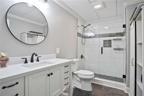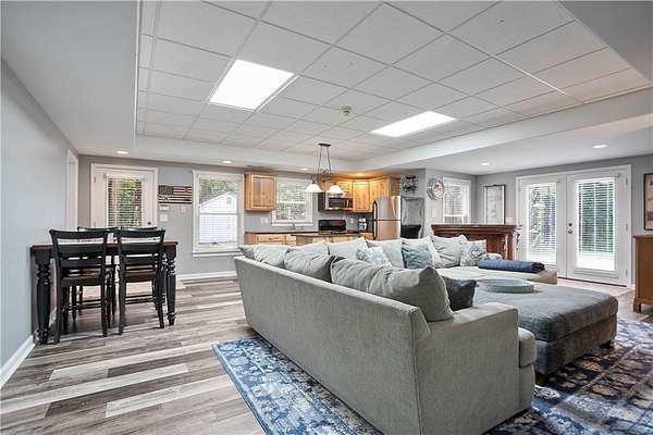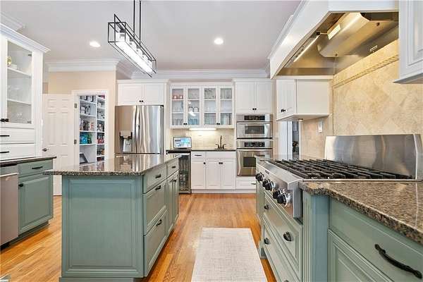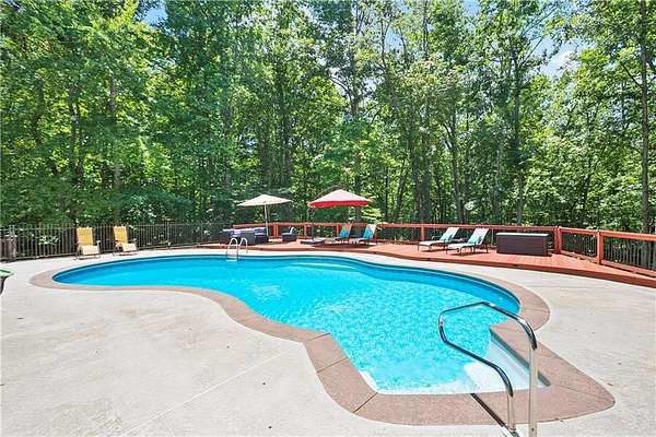 Discover Southern Charm in this 6-bedroom, 4.5-bathroom estate on 5.5 private acres. This property blends timeless elegance with modern convenience-perfect for everyday living, multi-generational needs, and unforgettable entertaining. Step into the impressive two-story foyer, where 12-foot ceilings, rich hardwood floors, and massive picture windows fill the home with natural light. Formal living and dining rooms frame the entrance beautifully, leading into an open-concept great room that flows seamlessly to a sprawling deck. At the heart of the home is a chef-inspired kitchen featuring an oversized island, Energy Star appliances, stone countertops, and a custom 8x10 walk-in pantry. Just beyond the kitchen you'll find a second family room and a bright sunroom offering direct access to the deck. The main-level owner's suite is a true retreat with two walk-in closets (one with a secondary laundry area) and a spa-style bathroom with dual vanities, whirlpool tub, and frameless glass shower. Upstairs includes a second living area and three generously sized bedrooms, each with ample storage and access to two full bathrooms. The fully finished terrace level is designed for versatility and multi-generational living, offering a complete in-law suite with two bedrooms, a full kitchen, private living room, updated bathroom, and a reinforced storm shelter with steel safety door. Outdoors, enjoy a private, resort-style setting with an expansive deck overlooking the saltwater pool, surrounded by mature trees and manicured landscaping for unmatched privacy. Perfect for hosting gatherings or unwinding on warm summer evenings.