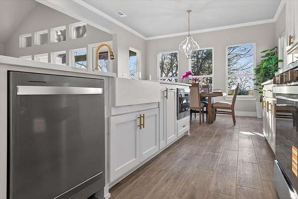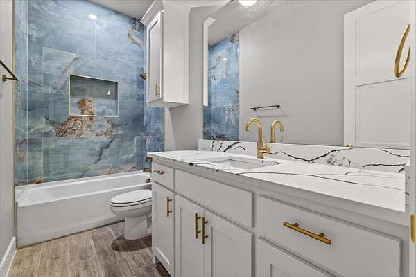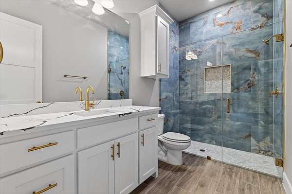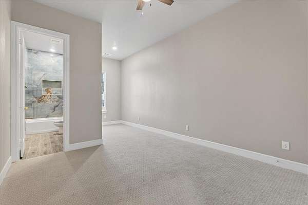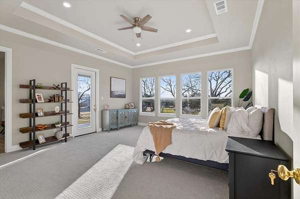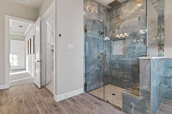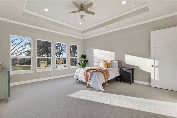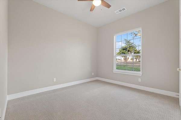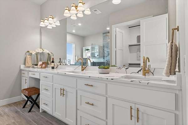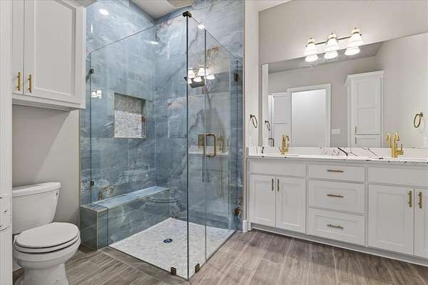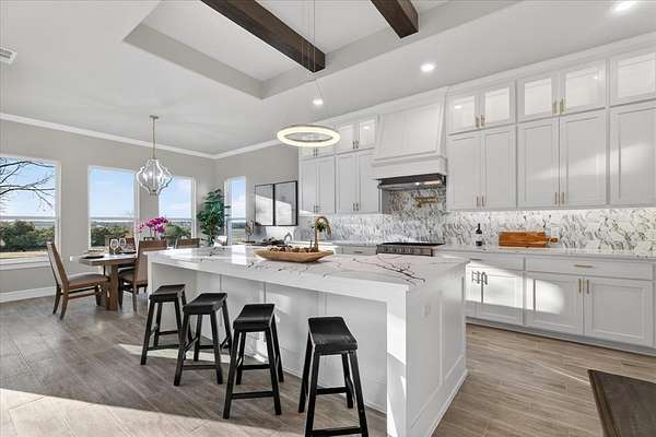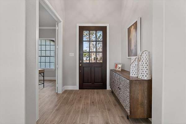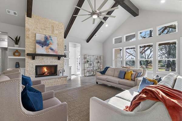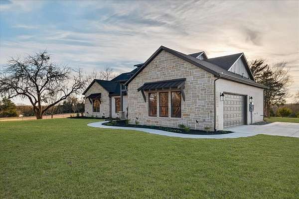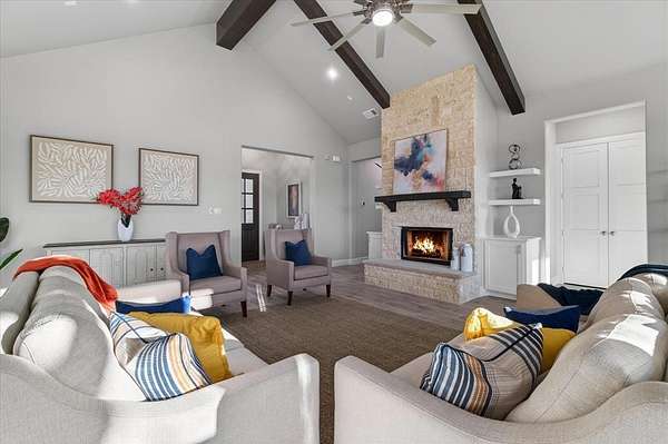 Welcome to this INCREDIBLY stunning, highly upgraded home showcasing designer finishes and thoughtful functionality throughout! Beautiful wood-like tile flooring flows seamlessly throughout, complemented by extensive recessed can lighting and abundant natural light from a wall of windows overlooking the backyard. The chef's kitchen is the heart of the home, featuring an oversized luxury island, stainless steel appliances, glass mosaic backsplash, 42-inch cabinetry with crown molding and stacked uppers, brushed gold hardware and fixtures, pot-and-pan pullout drawers, built-in spice racks flanking the oven, soft-close drawers, trash pullout, and a striking fireclay farmhouse apron sink. An upgraded large walk-in pantry adds a custom touch. The spacious living area is anchored by a dramatic floor-to-ceiling stone fireplace with a wood mantle. A functional office with a closet at entry of home that could be used as a 5th bedroom and utility room that includes a built-in sink and additional 42-inch cabinetry. Retreat to the private primary suite featuring a vaulted ceiling and elegant candle-style lighting. The spa-inspired primary bath boasts a freestanding soaking tub, dual vanities, and a separate walk-in shower with floor-to-ceiling tile and upgraded stone shower floor. The oversized closet is outfitted with custom built-ins and drawers. All bedrooms include ceiling fans with light kits. Two secondary bedrooms offer en-suite baths. Additional highlights include an oak front door with glass inserts, modern brushed gold fixtures throughout, upgraded tuft carpet in all bedrooms, and full gutters with integrated extensions. Enjoy outdoor living on the covered patio overlooking a serene backyard with many pecan trees that will provide shade in those warm Summer days. This home perfectly blends luxury, style, and everyday convenience -- truly move-in ready!