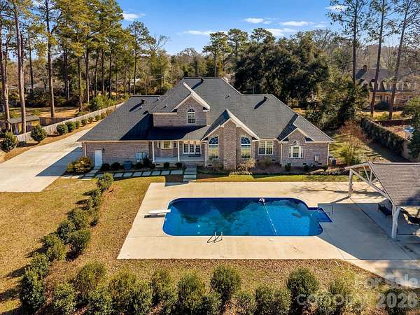 Look no further, this home has it all. Discover timeless elegance and modern comfort in this luxurious custom home. Attention to every detail, the craftsmanship include stone tiles, hardwood floors and crystal chandeliers Nestled on 1.7 acres lot, this stately residence offers the perfect blend of of sophistication and family comfort. With the abundant natural light, this house radiates a warm, inviting atmosphere The grand entrance highlights a soaring two-story foyer The main level leads to a formal dining room, a home office complete with fireplace and built in bookcase, The open floor plan allows for a seamless flow between the living room with cozy fireplace and a chef's inspired gourmet kitchen with a sunny breakfast nook. The highly sought luxurious primary suite located on the lower level does not disappoint. The primary bathroom has a spa like ambience and features his and her closets The lower level also encompasses a flex room that could serve as a fifth bedroom or studio A convenient half bath completes the lower floor plan. Ascend the sweeping staircase to the upper level, where you'll find three spacious bedrooms and two full baths-perfect for families or guests Outdoors, step outside to your own private retreat. A built-in saltwater pool with an expansive gazebo with fireplace and outdoor TV creates a perfect haven for family or guest entertainment This home offers best of both worlds- a quiet and secure environment w easy access to beaches or Charlotte.