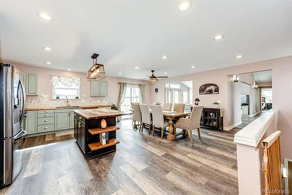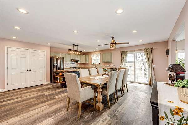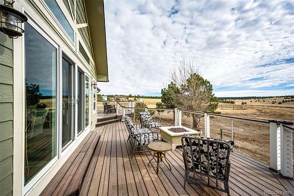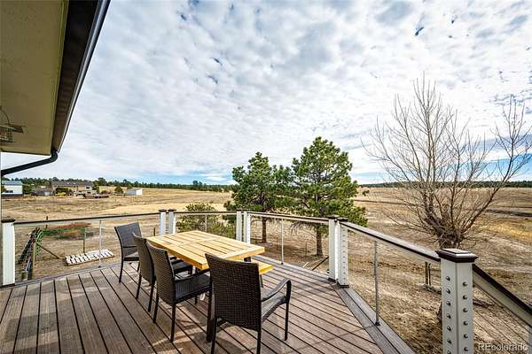 Remodeled ranch style home on 19 acres just minutes from Elizabeth. This home features upgrades such as luxury vinyl plank flooring throughout the main level and the basement. The darling country kitchen offers newer stainless steel appliances, butcher block countertops and massive walnut island with live edge. The dining room, the family room and the primary suite all walk out to a massive west facing Trex deck. The open floor plan features a spacious kitchen and dining room, a large family room with brick fireplace and spacious primary suite and primary bathroom. The basement is 90% finished with three additional bedrooms, a beautifully remodeled 3/4 bathroom. The home has newer exterior paint and roof. The property offers a 30 x 40 barn with four stalls, tack room and hay storage and the lot is fenced and cross fenced into several pastures. The graded arena is approximately 60 x 100 with sand footing. The parcel offers amazing views and no covenants! All measurements are approximate.