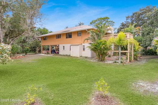 NEW VALUE!! MAJOR PRICE IMPROVEMENT!! SELLER IS READY TO MAKE A MOVE!! NO FLOOD INSURANCE REQUIRED!! NO HOA!! LOW INSURANCE WITH AGRICULTURAL/RESIDENTIAL ZONING!! This is a one-of-a-kind property you have to see in person to take in all that it has! A Beautiful private estate where you will feel like you are on an exotic vacation year-round, framed by magnificent granddaddy oaks, lush landscaping, and exceptional natural privacy, offering a unique slice of Old Florida on 2.4 acres. This two-story home offers 4,332 total square feet with 2,312 square feet of living area, featuring 5 bedrooms, 3 bathrooms, and covered parking beneath the home for up to 4 vehicles. Featuring a private and independent entrance, the lower level provides ideal space for an in-law suite, home office, gym, workshop, or flex space. Property is zoned Agricultural with an impressively low annual premium of approximately $2,700. The property includes a four-stall horse stable with electric, a chicken coop with 11 hens producing approximately 4 dozen eggs weekly, a 10' x 20' shed, optional goats, and several tropical fruit trees. Bring the toys! plenty of room for RVs, boats, trailers, equipment, and livestock. The property offers both front and rear access and potential for an additional residence (buyer to verify). Major improvements include roof (2022), HVAC (2022), electrical updates (2022), remodeled kitchen (2024), double-pane front windows (2023), LVP flooring (2023), gutters (2023), sundeck, screen enclosure, water filtration system, interior and exterior paint (2024), updated bathrooms, new doors, and washer (2025). This prime Grant-Valkaria location places you just 2 miles from the Valkaria Airport and The Habitat at Valkaria Golf Course, 3.5 miles from the Indian River's fishing pier and boat ramp, 9 miles from Melbourne Beach, and approximately 20 miles from the world-renowned Sebastian Inlet, with the beloved annual Seafood Festival held each March. Homes like this are rarely available-schedule your private showing today!