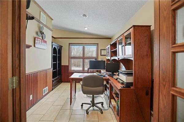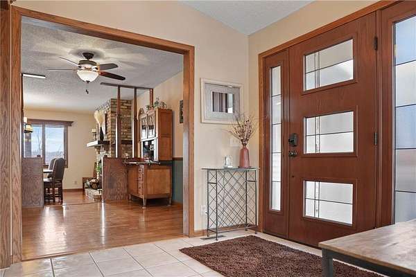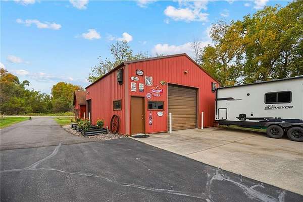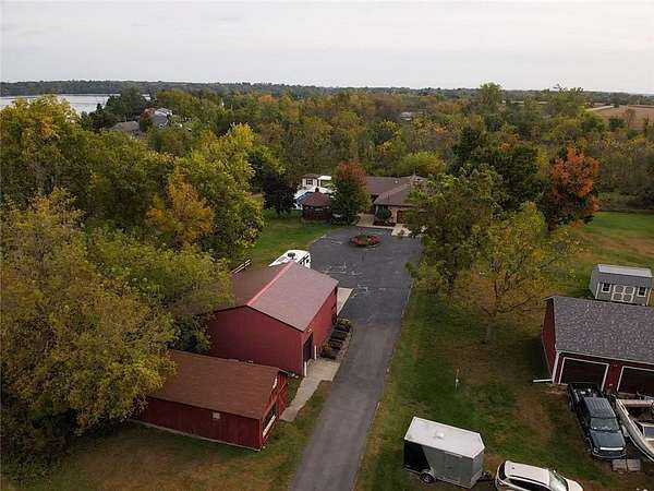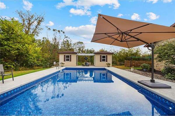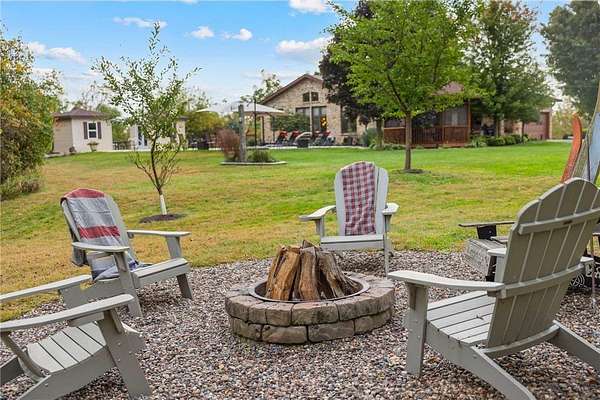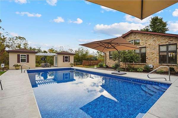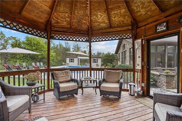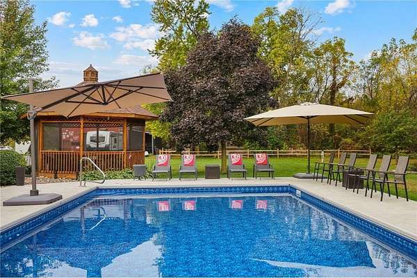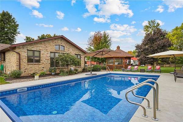 Gracefully set on 2.8 scenic acres with an additional .58-acre lake lot, this distinguished brick and stone residence offers a rare blend of timeless craftsmanship and elevated country living. The home’s stately presence and mature landscape create an immediate sense of quiet refinement.Inside, inviting gathering spaces provide warmth and character — a welcoming great room with gas fireplace and wet bar, and an elegant dining room anchored by a stunning wood-burning fireplace, perfect for hosting intimate dinners or holiday celebrations. The thoughtfully updated kitchen features stainless steel appliances, an induction cooktop, and refined finishes that blend beauty and functionality.Three bedrooms are conveniently located on the main level, along with an updated bath and a dedicated office space ideal for today’s lifestyle. The fully finished lower level extends the home’s livability with a spacious family room, bar area with new LVP flooring, updated laundry and bath, two versatile flex rooms for guests, fitness, or creative use, and abundant storage.Significant mechanical updates reflect pride of ownership and thoughtful care, including two furnaces, dual sump pumps, Kinetico water system, and A/C replaced in 2018.Outdoors, the property transforms into a private retreat designed for both relaxation and celebration. The heated 20x40 saltwater in-ground pool (2023) is complemented by two charming pool houses — one finished as guest bunk space with heating and air conditioning for year-round comfort, and the other for convenient storage. A screened gazebo, covered patio, and inviting fire pit create intimate spaces to unwind under the stars.The impressive 28x32 pole building with 12’ lean-to, cement floor, and multiple camper hookups offers exceptional versatility, while the expansive 34x14 barn/workshop provides additional room for hobbies, storage, or entrepreneurial pursuits. Mature fruit trees — apple, peach, pear, and cherry — along with raspberry and gooseberry bushes add seasonal beauty and abundance to this remarkable setting.A property where sophistication meets serenity — beautifully maintained and ready to welcome its next chapter!