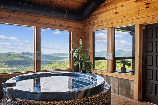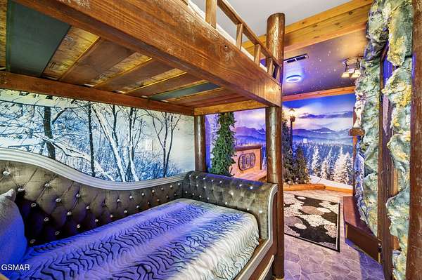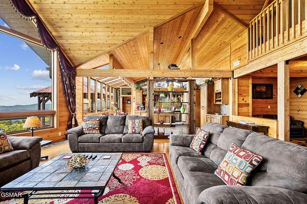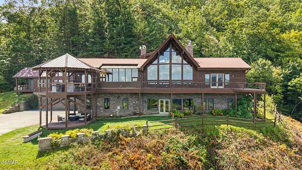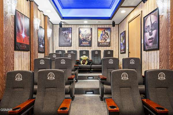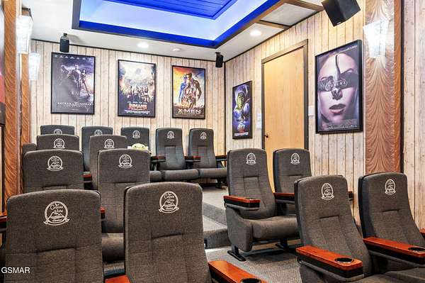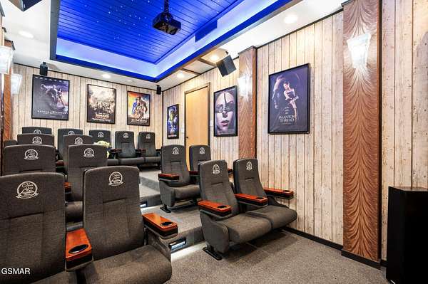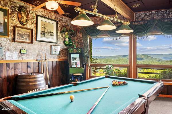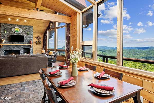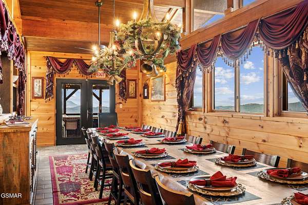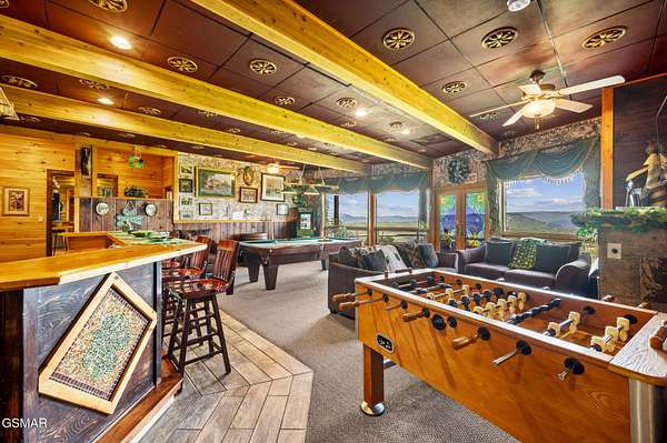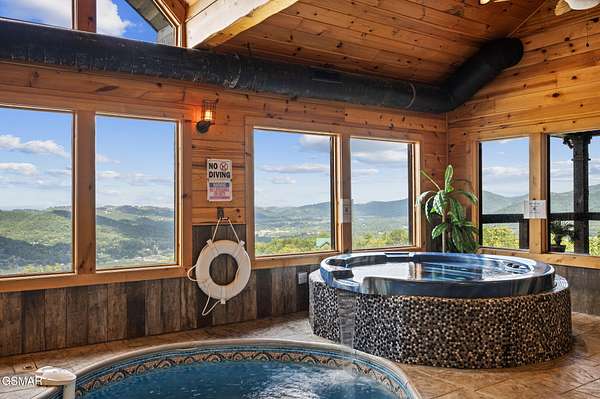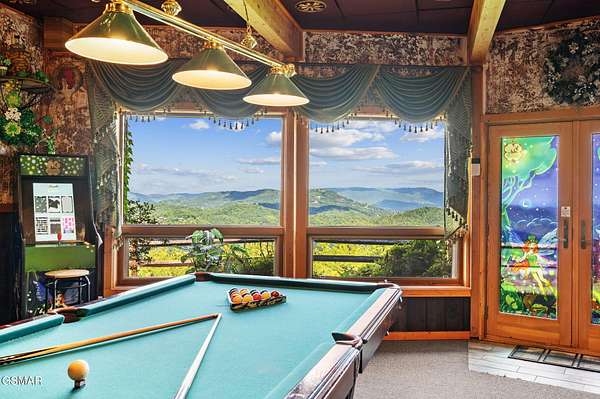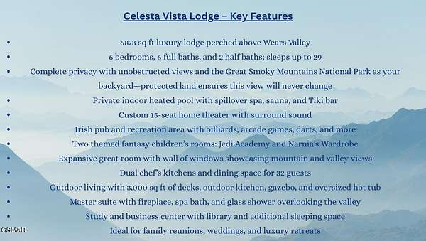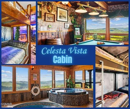 Introducing Celesta Vista Lodge, a true masterpiece in the Smoky Mountains where luxury meets imagination. Perched more than one thousand feet above Wears Valley and bordering the Great Smoky Mountains National Park, with almost 7,000 square feet, this estate lives up to its name, which translates to ''heavenly view.'' From the moment you arrive, panoramic vistas of Wears Valley, Bluff Mountain, and Hatcher Mountain surround you, creating an unforgettable backdrop for every gathering. This extraordinary six-bedroom, eight-bathroom retreat was designed for large families, reunions, weddings, and group getaways. Extensively renovated, including the addition of a private indoor pool house, Celesta Vista is a rare opportunity to own a luxury property very unique to our area. Every detail was thoughtfully created to deliver a once-in-a-lifetime mountain experience. Entertainment abounds with a fully appointed Irish-style pub, complete with billiards, arcade games, and space for celebrations that last well into the night. A custom fifteen-seat movie theater brings the magic of cinema home with surround sound and VIP seating. The indoor pool house is a resort-level escape, offering a heated swimming pool, spillover spa, sauna, and a tropical-inspired Tiki bar overlooking the mountains. Celesta Vista is also filled with touches of wonder. Children and the young at heart will be drawn to two themed fantasy bedrooms-The Jedi Academy, designed as a futuristic starship, and Narnia's Wardrobe, a snowy wonderland hidden behind a wardrobe door. Each space creates memories guests will talk about long after their visit. The main level features a breathtaking great room with floor-to-ceiling windows framing the sweeping valley views. Two chef's kitchens and a grand dining area make hosting effortless. The expansive primary suite offers its own fireplace, spa-style bathroom, and glass-enclosed shower with a view straight into the valley. Outdoor living rivals the interior, with more than 3,000 square feet of decks, a gazebo, an outdoor kitchen, a large hot tub, and landscaped spaces that showcase the Smoky Mountain horizon. Celesta Vista Lodge is more than a luxury cabin-it is an investment in a lifestyle defined by unmatched scenery, extraordinary amenities, and unforgettable experiences. Located just minutes from Pigeon Forge and Gatlinburg, with direct access to the Great Smoky Mountains National Park, it represents the pinnacle of mountain living and the ultimate short-term rental opportunity in East Tennessee.