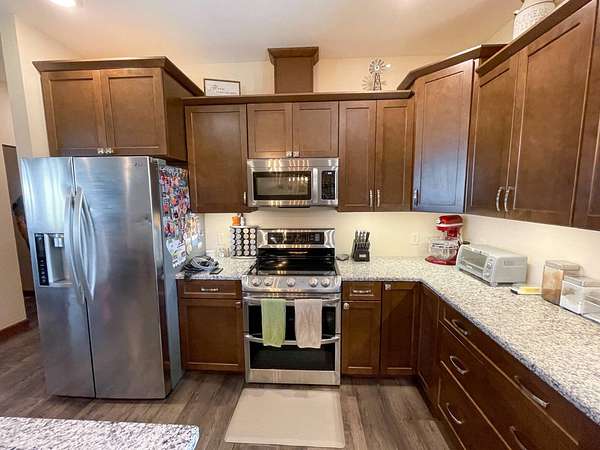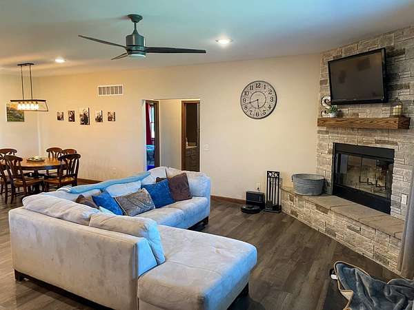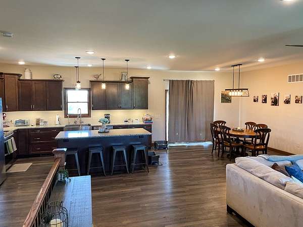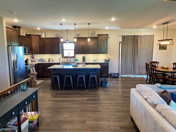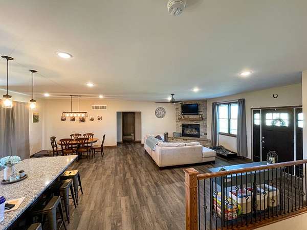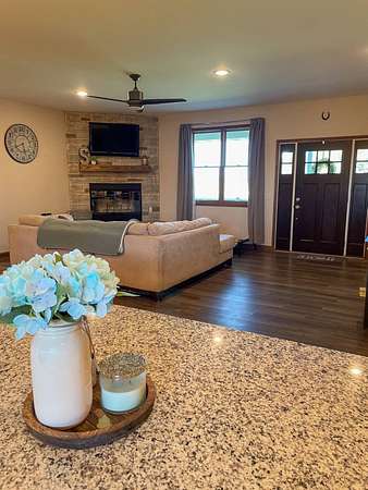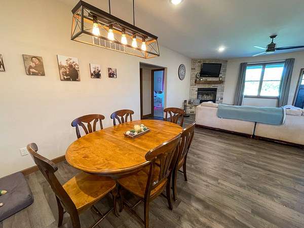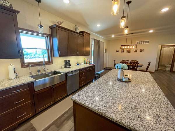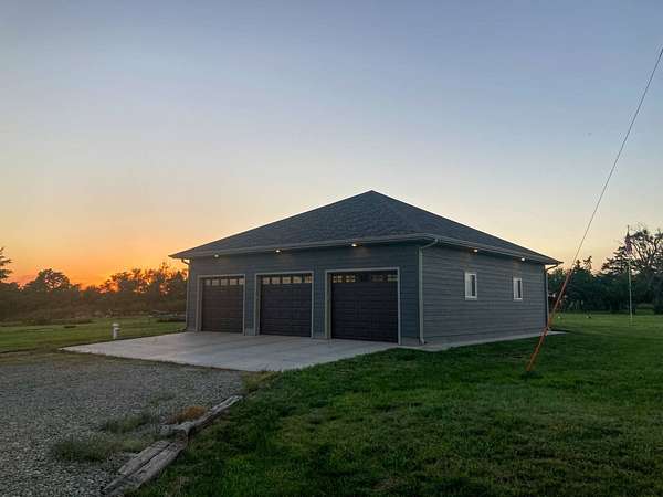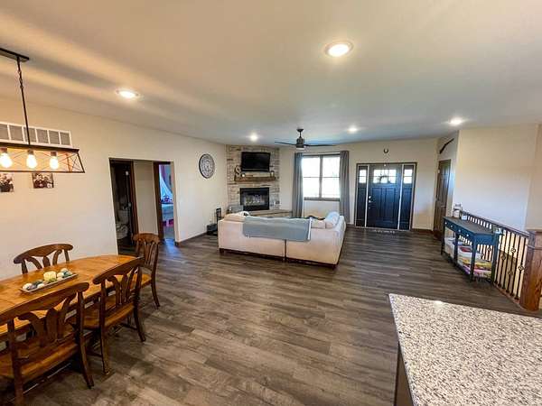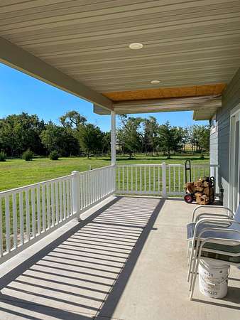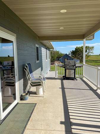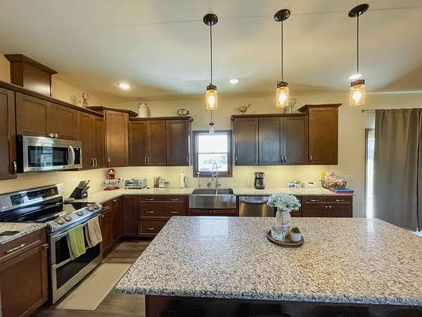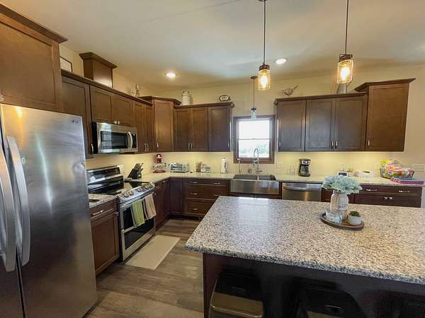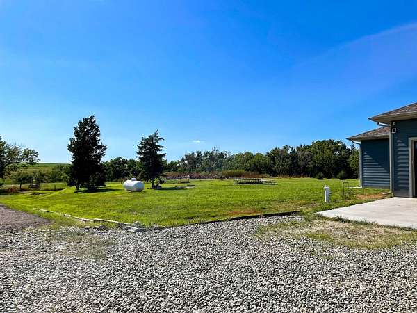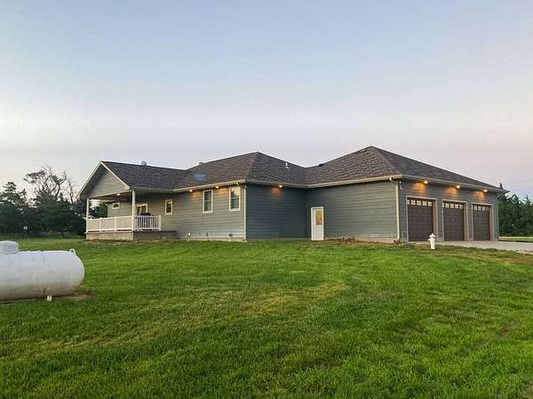 Discover the perfect blend of modern comfort and peaceful country living in this beautifully crafted 2020 home, set on approximately 10 acres. Designed with both functionality and style in mind, this 5-bedroom, 3.5-bath residence offers space to grow, gather, and truly feel at home. Step inside to an inviting open-concept layout where the living, dining, and kitchen areas come together seamlessly-ideal for entertaining or everyday living. The kitchen is a standout feature, complete with stainless steel LG appliances, a farmhouse sink, granite countertops, custom soft-close cabinetry and walk-in pantry. A large granite island provides the perfect centerpiece for meals, conversations, and celebrations. In the living area, a striking rock fireplace adds warmth and character, creating a cozy atmosphere during cooler months. The main level includes a spacious primary suite with a walk-in closet and private bath, along with two additional bedrooms and a full bathroom. A conveniently located utility room sits just off the oversized 3-car garage, making daily routines effortless. Downstairs, the expansive basement offers endless possibilities-whether you envision a home theater, game room, fitness space, or retreat from the summer heat. Two additional bedrooms with egress windows, plus a flexible office or bonus room, provide even more versatility. Enjoy breathtaking sunrises and sunsets from the front and back porches, where the wide-open views and quiet surroundings truly shine. The oversized 3-car garage includes extra space perfect for a workshop, hobbies, or additional storage. The property also features two large, older livestock or storage buildings, adding even more functionality to this already impressive acreage. Skip the wait to build-this move-in-ready home offers the best of rural living with modern amenities already in place. Whether you're looking for more space, a place to work from home, or simply a peaceful escape from the city, this property delivers it all.