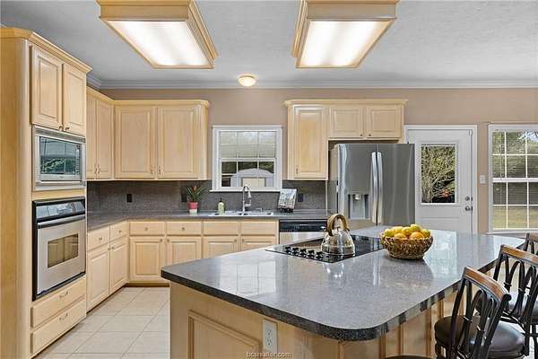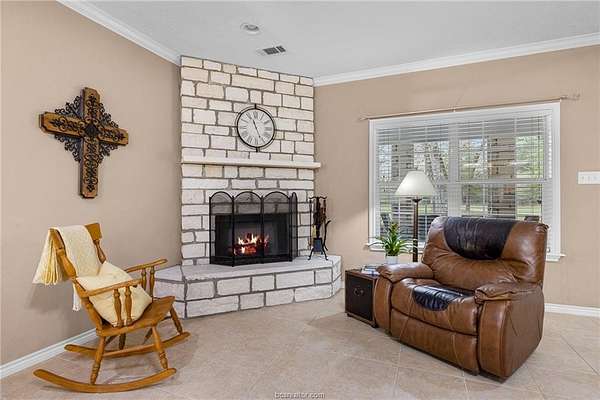 Tucked away in the tall live oak trees is a, well-maintained one-story Limestone Rock home that blends classic character with comfortable everyday living. It features 3 bedrooms, 2 bathrooms, an eat-in kitchen with a dedicated dining area, and a spacious living room. Located less than 5 miles from Hearne, this property offers both convenience and a peaceful country lifestyle. Inside, the open floor plan is perfect for entertaining or relaxing by the cozy corner fireplace. High ceilings throughout enhance the home's bright, airy atmosphere. Set on 5 acres, the property boasts mature trees that provide shade, privacy, and a truly serene setting with zero road noise. Outdoor features include a large carport for ample parking and multiple storage sheds for tools, equipment, or hobbies, while the screened-in front porch offers a peaceful place to enjoy the natural beauty around you. A newly built two-story metal building adds incredible versatility. It features a concrete floor, Hardie plank siding, full electric, and a covered front overhang-making it ideal for a workshop, guest quarters, or future projects. Don't miss the opportunity for this charming property that is move-in ready!!