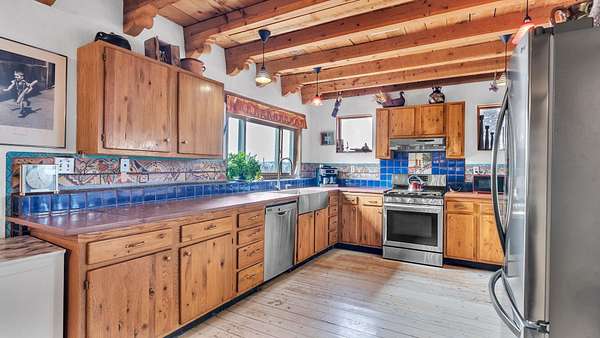 Rare Ranchette with an Adobe Residence, Guest Home & Water Rights in Magical Arroyo Hondo ~ Everything you've ever dreamed of exists right here. This rare property features a flowing acequia, an elegant, tastefully updated Adobe residence, and an income-producing guest home currently generating $2,000 monthly with potential for even more. Perfectly positioned for the outdoor enthusiast, you can play in the waters of the Rio Grande just minutes to the west, or head east through charming Arroyo Seco to experience the world-class slopes of Taos Ski Valley. Spanning just under three lush acres off a well-maintained, paved Hondo Seco Road, this private oasis offers supreme tranquility and some of the absolute best views in the Southwest. An unforgettable first impression awaits as you step through the enclosed flagstone patio and a breathtaking masterpiece sea glass door. Inside, an immediate sense of vibrant warmth fills the space, where abundant natural light highlights classy fixtures and endless Southwestern character. Stunning architectural details are everywhere, from the viga and beam ceilings down to the hardwood and Saltillo tile floors, beautifully complemented by a traditional fireplace, bancitos, corbels, and step-down walls perfect for displaying your art collection. The sunken den offers a welcoming gathering spot to cozy up by the fire, while a versatile back bonus room serves perfectly as a home office, studio, theater, or extra sleeping space. The home provides three spacious bedrooms and two comfortable bathrooms, highlighted by a large primary ensuite tucked quietly at the back of the home with beautiful light, a highly functional bathroom, and private access to the yard. At the heart of the home, the open-concept dining room and kitchen-complete with a second egress to the back deck-provide the ideal setting for morning routines and entertaining dinner guests. Step outside to the enclosed, beautifully landscaped backyard to find a tranquil pond and fountain, creating a magical setting where you will love tending the garden, relaxing, and unwinding under a starry New Mexico sky.