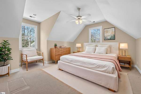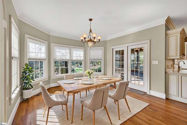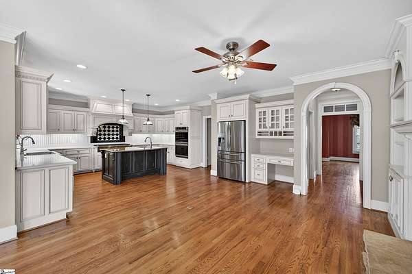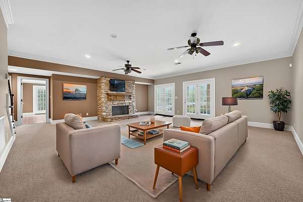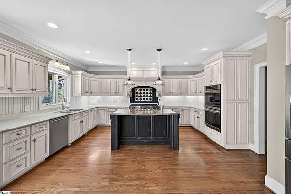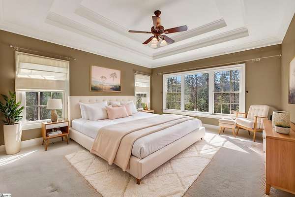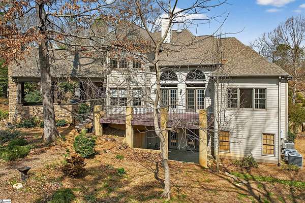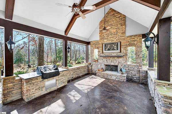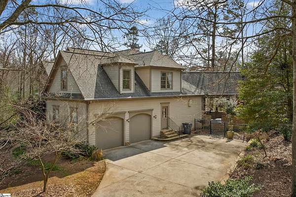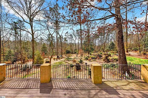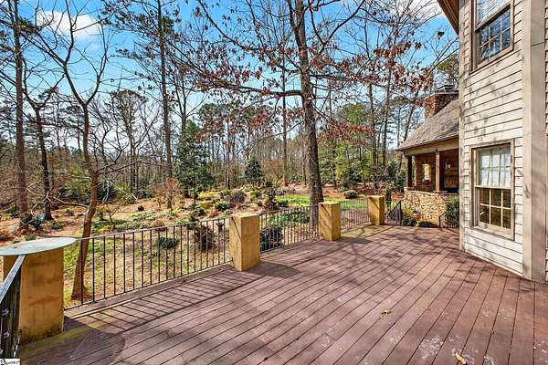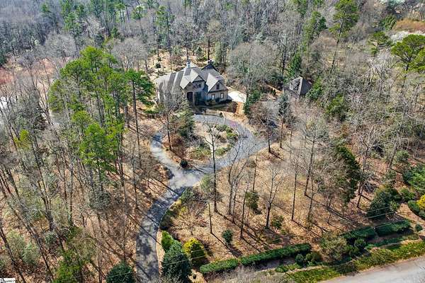 Welcome to your gracious, resort-style retreat on 2.7 acres of mature trees, tucked on a quiet cul-de-sac with easy access to Pelham Rd and Woodruff, and 10 minutes to GSP. This over 5,000 sq ft, 5-bedroom, 4.5-bath custom home, invites you with a welcoming foyer, and elegant formal dining and living spaces. The heart of the home features a sunlit central family room with high ceilings, patio doors opening to a large deck overlooking the beautiful backyard, and a stone fireplace that also opens to a keeping room, breakfast room and the chef’s kitchen—complete with a 6-burner Thermador cooktop, double ovens, and a large island. Step outdoors to a beautiful covered porch with a fireplace, built-in grill, and retractable blinds, perfect for year-round gatherings. The primary suite on the main offers serene views of the backyard and a spa-like ensuite with double vanity, walk-in shower, separate tub, and a spacious walk-in closet. Upstairs, three bedrooms, a Jack-and-Jill bath, ensuite bath and a playroom provide flexible spaces for family life. The expansive basement includes a bedroom and bath, a large office, and a generous gathering room with a stone fireplace, plus walk-out access to the yard. Offering perfect space for guests or an in-law suite. Practical comforts abound: laundry with sink, central vac, recently installed HVACs (12/2024), and both an attached 2-car garage and a detached 2-car garage with extra storage, plus a circular drive for effortless arrivals. The grounds have been lovingly cared for by a master gardener, creating inviting outdoor rooms and year-round beauty. This home blends space, warmth, and sophisticated outdoor living—make it yours with a private showing today.