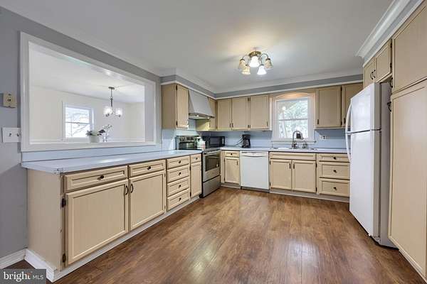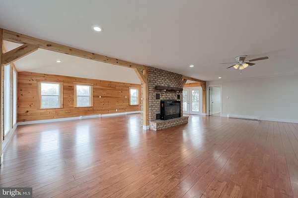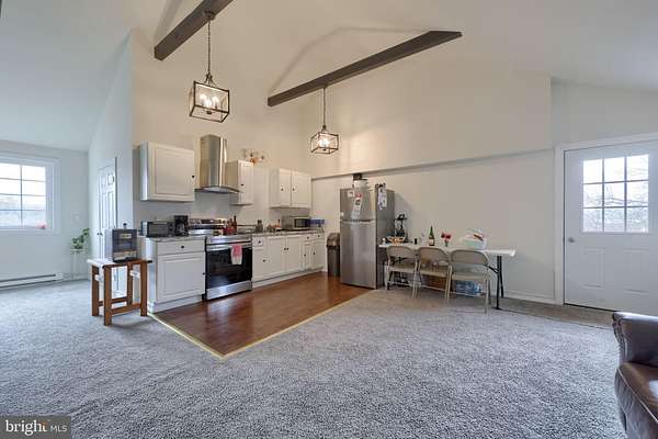 - Dining Area, Exposed Beams, Family Room Off Kitchen, Open Floor Plan, Wood Stove
