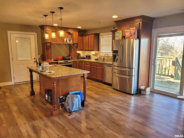 This custom-built home in 2016 sits on approximately 2.5 acres. The property offers great energy efficiency with foam insulation in the crawlspace, attic, exterior walls, and porch roof. Inside, you'll find a spacious living area with tall, vaulted ceilings and durable luxury vinyl flooring that's scratch and water-resistant. The heart of the home is the kitchen, featuring custom cabinets, granite countertops, soft-close drawers and handy pull-out spice cabinets. The large 3'x6' island is perfect for cooking and includes pop-up outlets and USB ports for your convenience. The primary suite is a relaxing retreat, complete with a stunning 6-foot walk-in marble shower and custom cabinetry in both bathrooms. Every detail is designed for comfort and style. For added safety, there's a storm shelter/saferoom in the garage. Spend your evenings on the 50-foot covered front porch enjoying the peaceful surroundings. This home is a perfect choice for those looking for a private getaway with modern amenities.