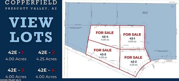 Est $1,603/moBehind the gates of Prescott Valleys newest gated community, you will find this 4-acre parcel on a cul-de-sac offering views from all angles. Copperfeild is known for its expansive lots and luxury custom homes - this site is ready for your new home!