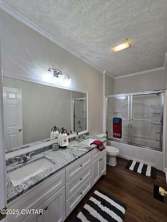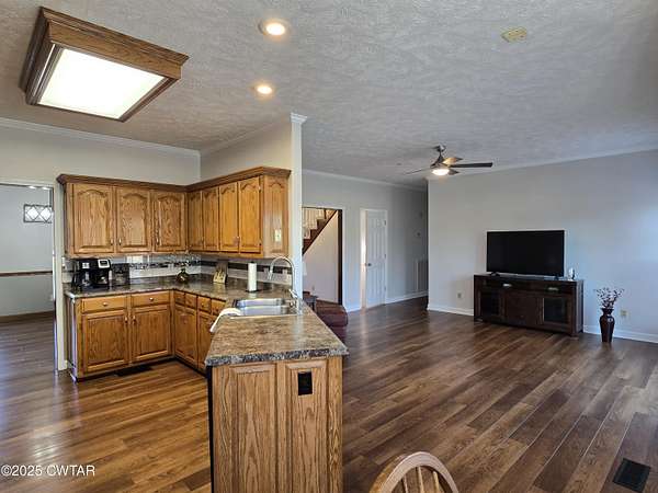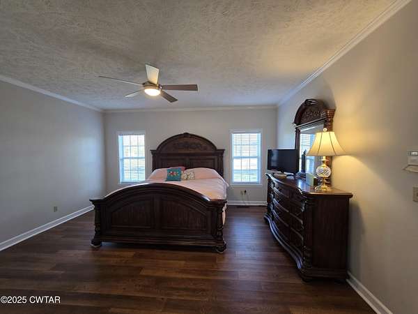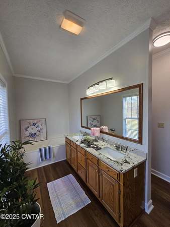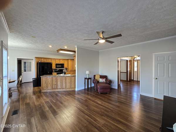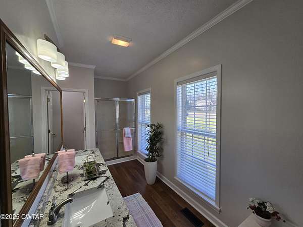 - Blown/Textured Ceilings, Ceiling Fan(s), Crown Molding, Double Vanity, Eat-In Kitchen, Entrance Foyer, Fiber Glass Shower, Granite Counters, High Ceilings, Kitchen Island, Laminate Counters, Open Floorplan, Pantry, Primary Downstairs, Soaking Tub, Tub Shower Combo, Walk-In Closet(s)