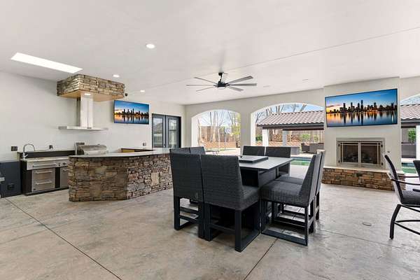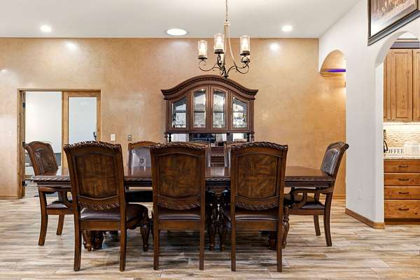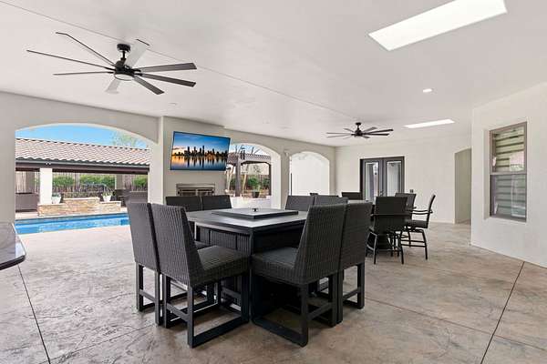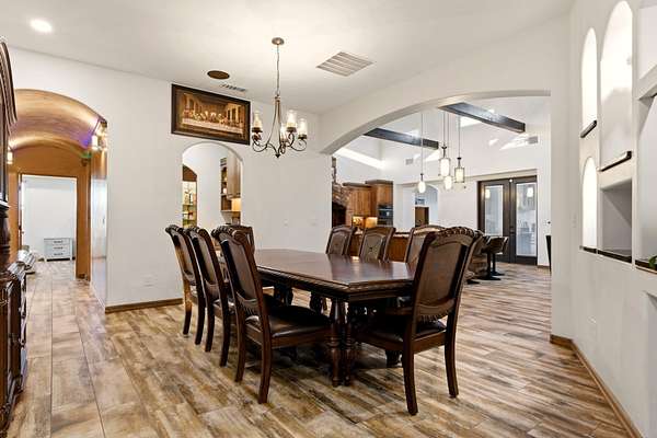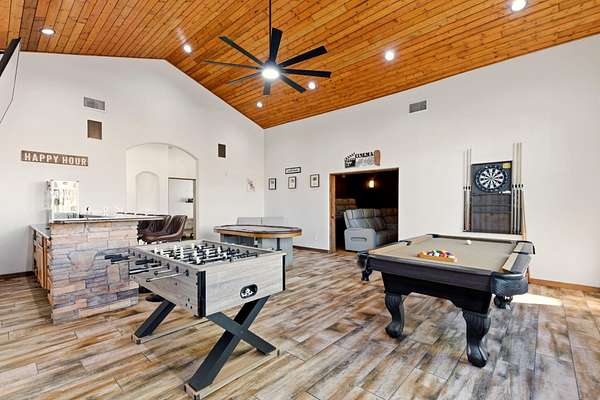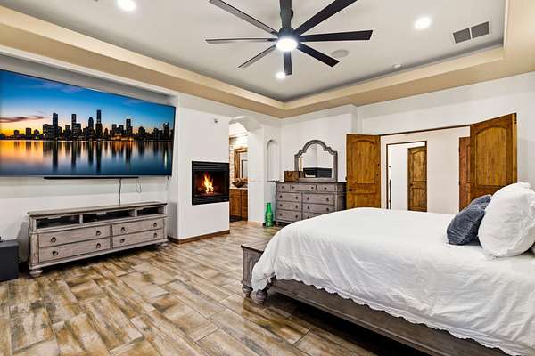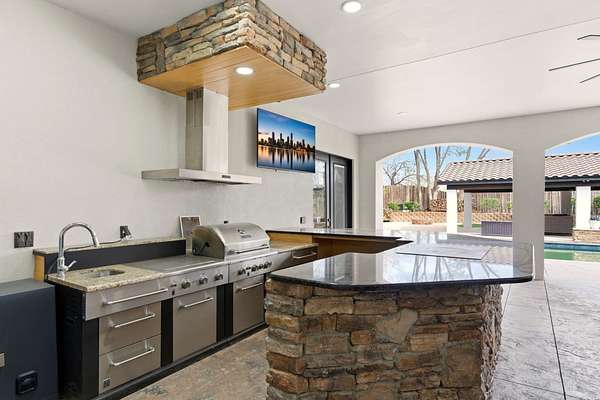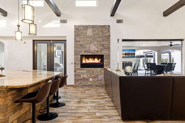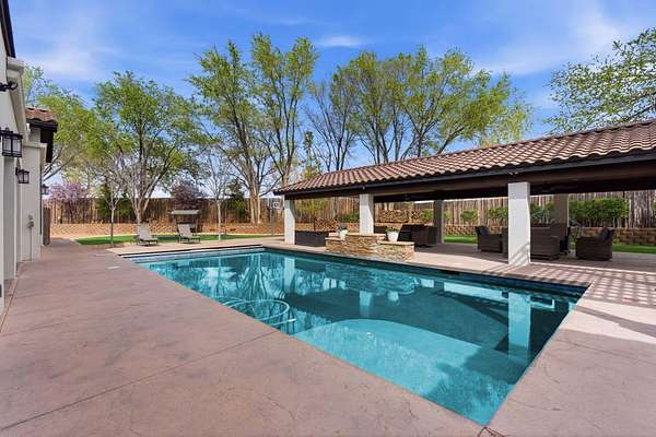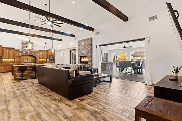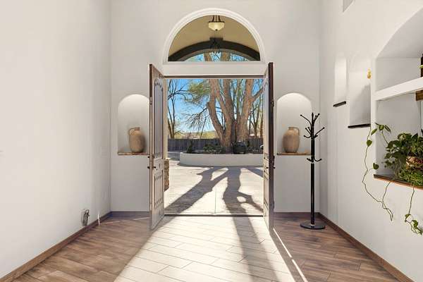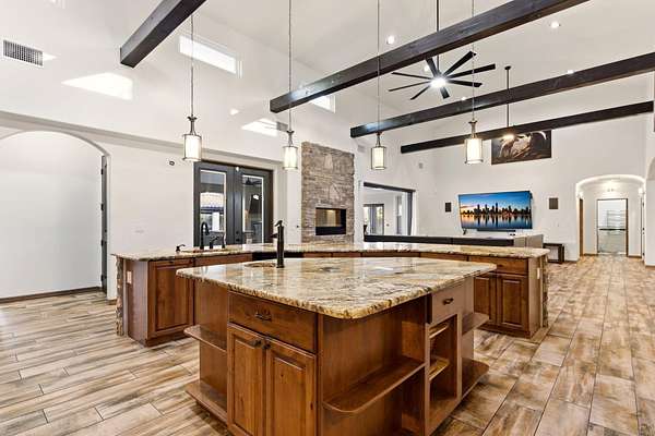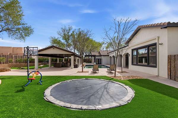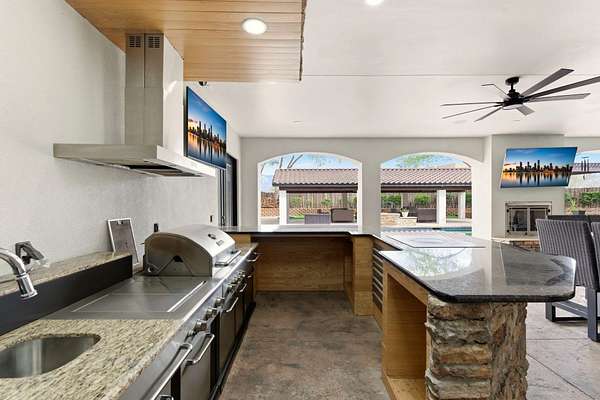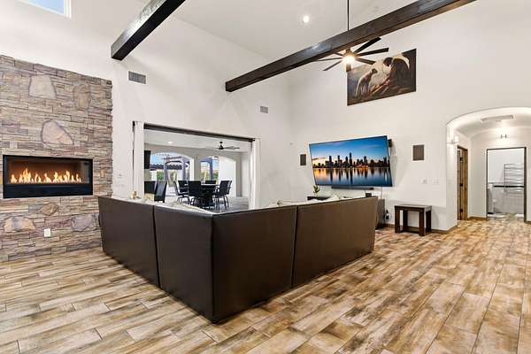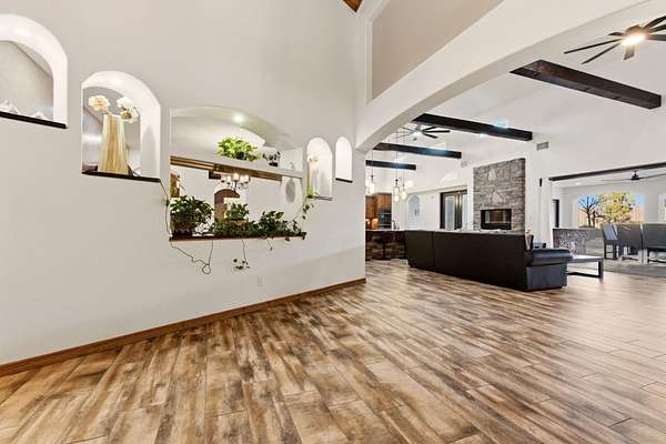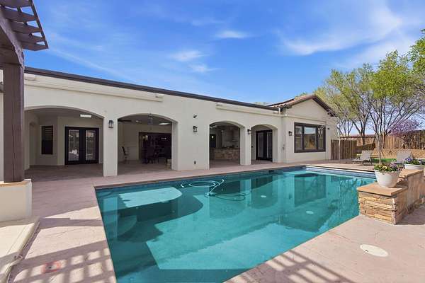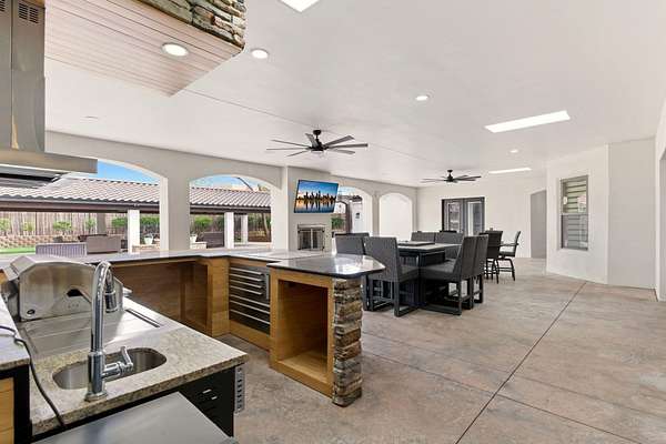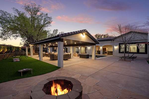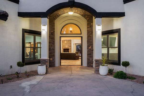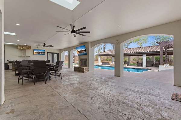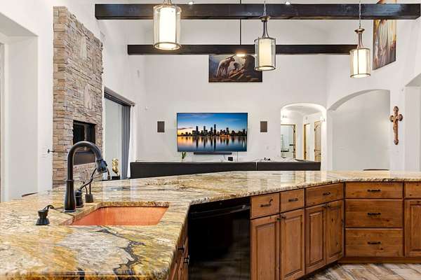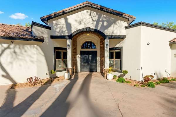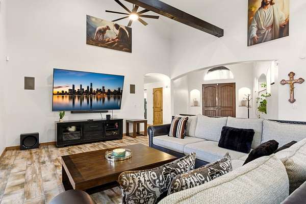 Sophistication meets serenity in this luxurious 1.7 acre estate. Soaring wood-trussed ceilings and classic high-end finishes create an atmosphere of timeless elegance. The heart of the home is a chef's sanctuary, featuring a grand granite island, professional-grade appliances, and a dedicated butler's prep kitchen. Entertainment wing features a full wet bar, a tiered theater room, and a vast game room. The outdoor living space is resort style and a true oasis. Anchored by a sparkling pool, hot tub, outdoor kitchen featuring a specialty teppan grill, two outdoor covered patios, and newly installed latilla fence around the entire professionally landscaped property ensures absolute privacy. The property is completed by a fully equipped 2 bedroom guest casita, RV hookups, and paid off solar.