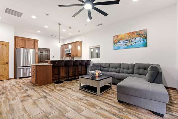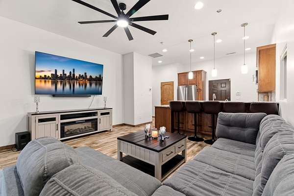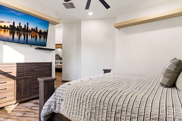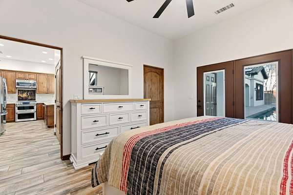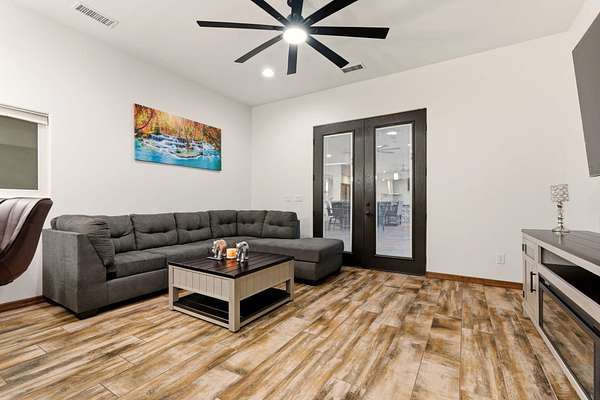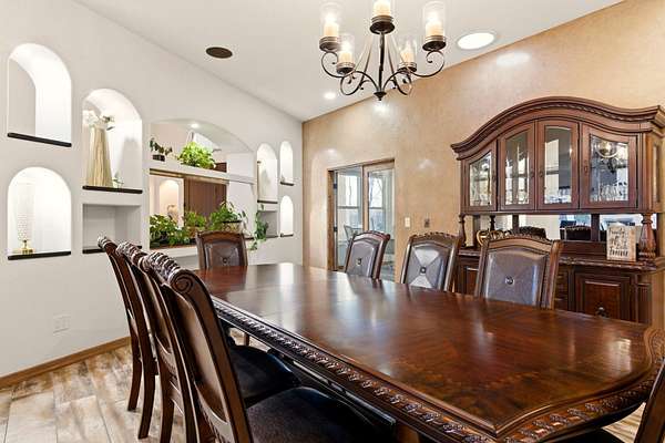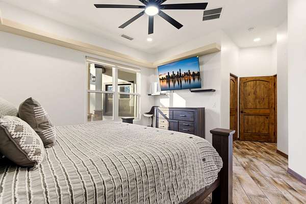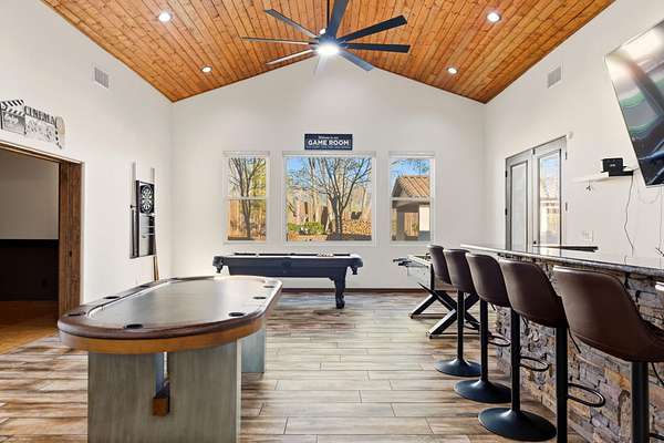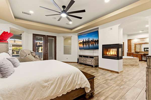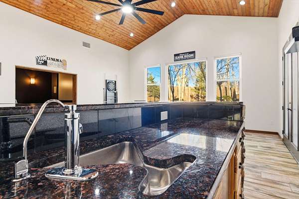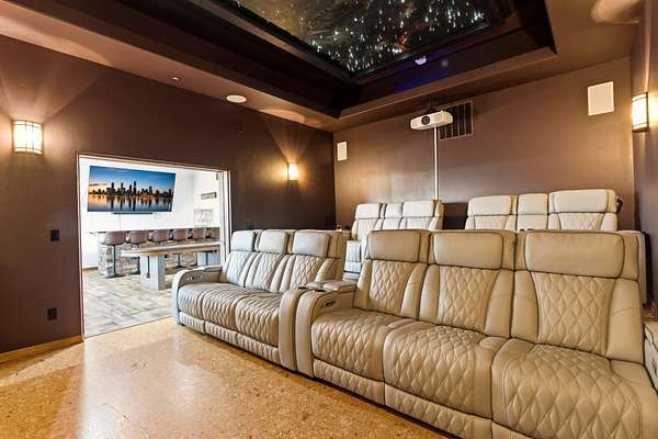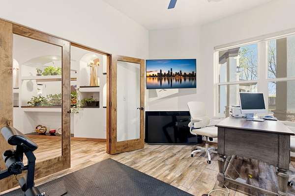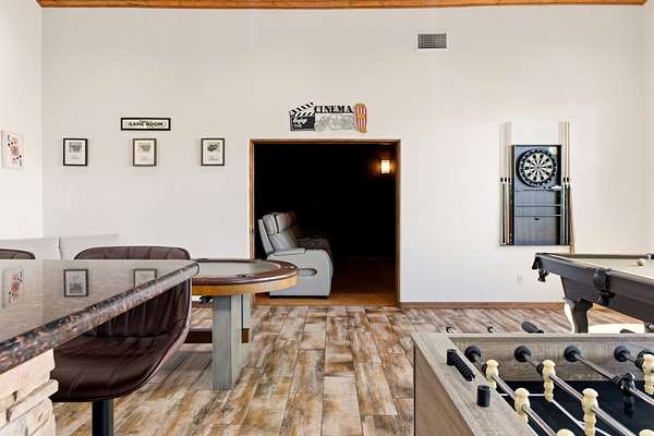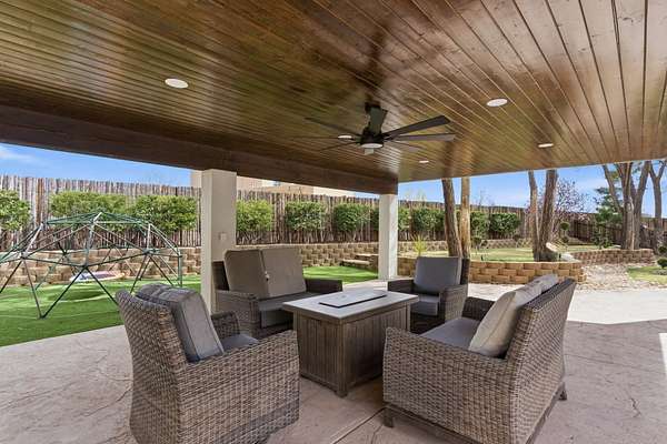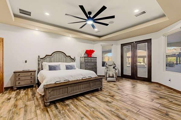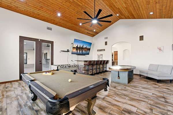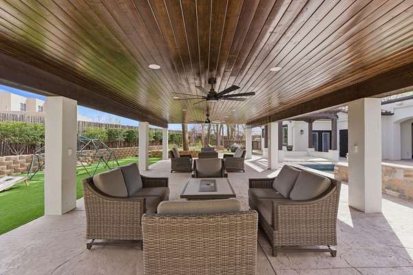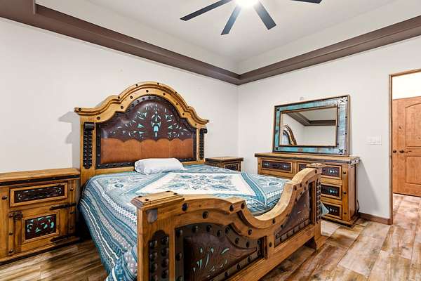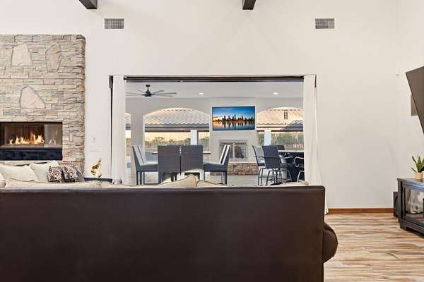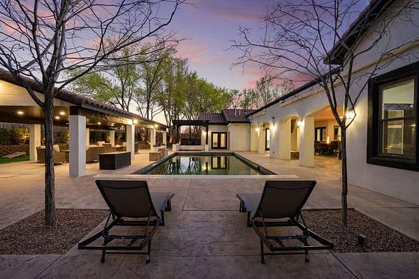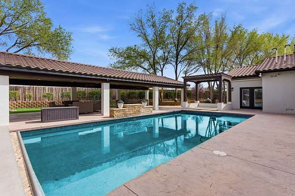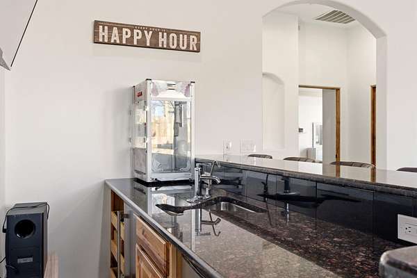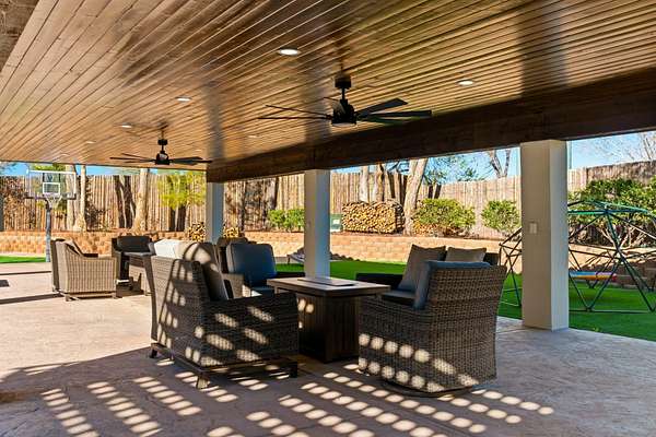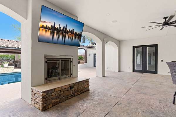 Sophistication meets serenity in this luxurious 1.7 acre estate. Soaring wood-trussed ceilings and classic high-end finishes create an atmosphere of timeless elegance. The heart of the home is a chef's sanctuary, featuring a grand granite island, professional-grade appliances, and a dedicated butler's prep kitchen. Entertainment wing features a full wet bar, a tiered theater room, and a vast game room. The outdoor living space is resort style and a true oasis. Anchored by a sparkling pool, hot tub, outdoor kitchen featuring a specialty teppan grill, two outdoor covered patios, and newly installed latilla fence around the entire professionally landscaped property ensures absolute privacy. The property is completed by a fully equipped 2 bedroom guest casita, RV hookups, and paid off solar.