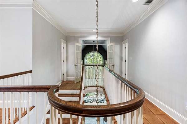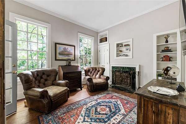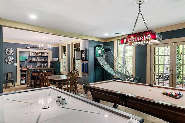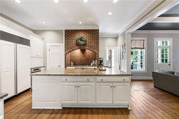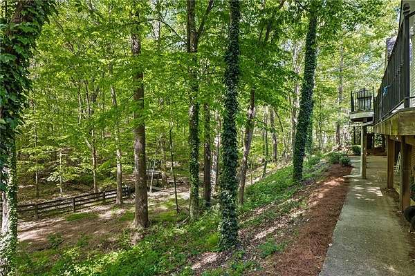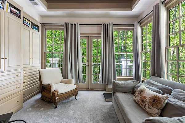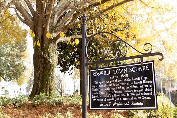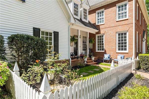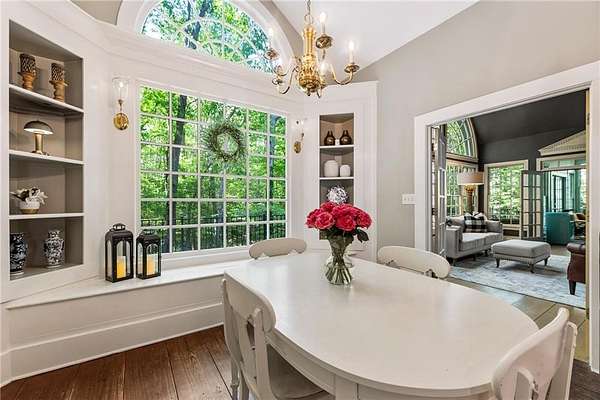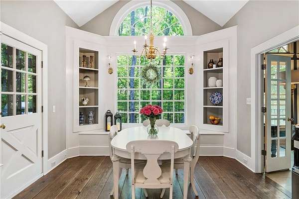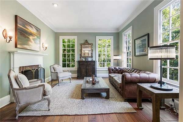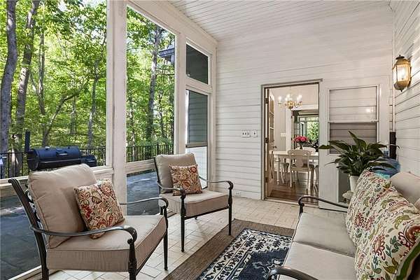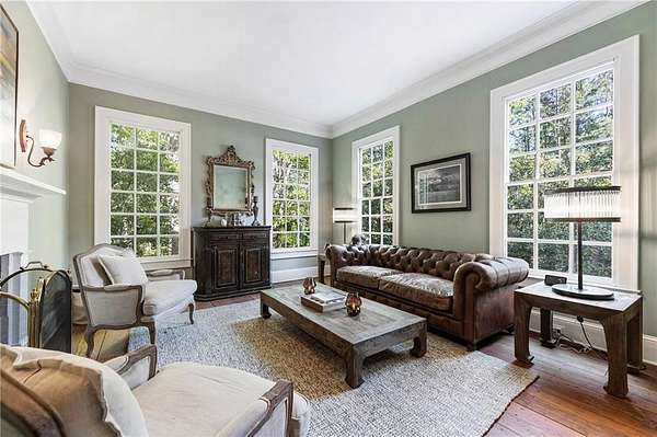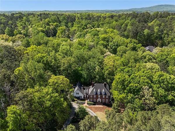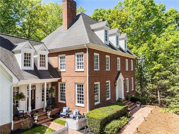 Set on over two acres of private, wooded grounds, this timeless Colonial-style estate, modeled after the Wythe House in Williamsburg, offers a rare blend of classic architecture, modern comfort, and serene natural surroundings within a vibrant neighborhood setting. A picturesque exterior, enhanced by a circular driveway, creates a striking first impression. Inside, 11-foot ceilings, wide-plank heart of pine floors, six fireplaces, fresh interior paint, and new carpet on the upper level add warmth, character, and architectural richness throughout. Designed for both everyday living and effortless entertaining, multiple French doors open to a stunning 64-foot flagstone patio spanning the rear of the home, creating seamless indoor-outdoor flow and peaceful views of the surrounding landscape. The fully fenced backyard offers both privacy and functionality, while a side yard provides the perfect setting for sports or play. The upper level features a true primary retreat with a private sitting room or office complete with French doors and its own fireplace, a generous walk-in closet, and a spa-inspired renovated bath. Flexible living spaces abound, including a private suite in the left wing with two bedrooms, a full bath, and a rear staircase, ideal for guests or multigenerational living. The fourth-floor bonus level adds exceptional versatility with a flex room and multiple walk-in cedar closets. Filled with natural light, the finished terrace level includes a family room, bedroom, full bath, and a wall of windows overlooking the tranquil grounds. With four finished levels, this home offers the best of both worlds: peaceful privacy and natural beauty paired with the benefits of a sought-after neighborhood. Enjoy swim, tennis, pickleball, a playground, and clubhouse, all just minutes from Historic Roswell's dining, shopping, and active community life.