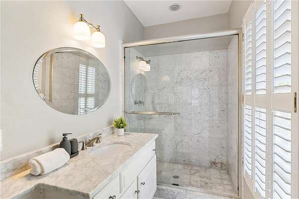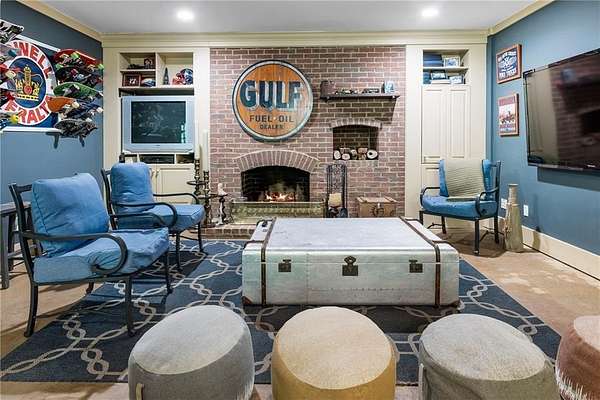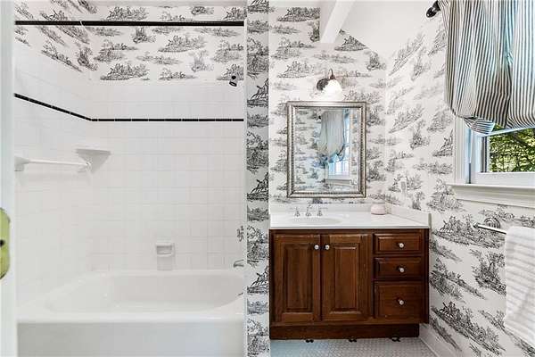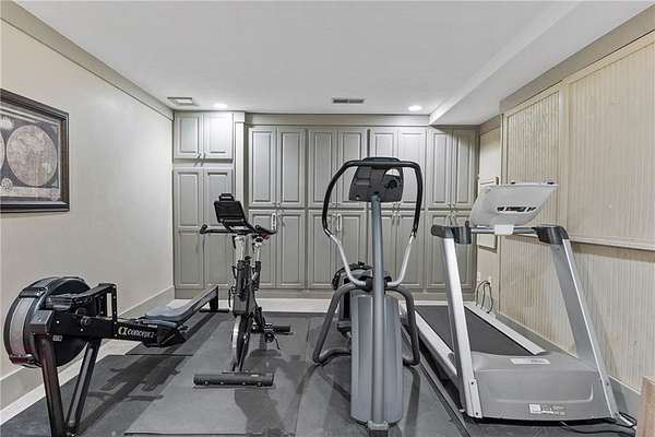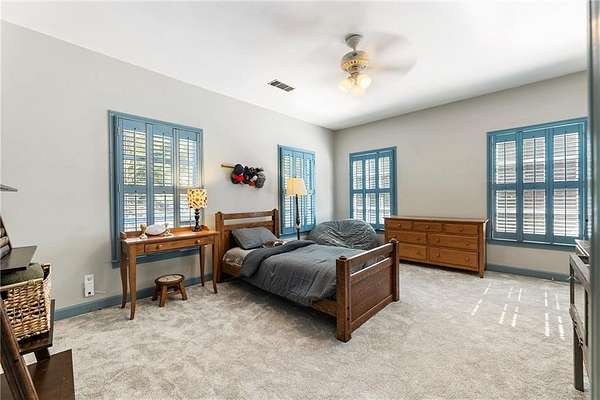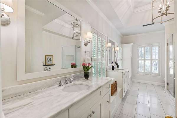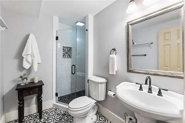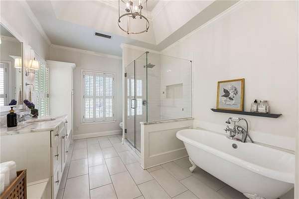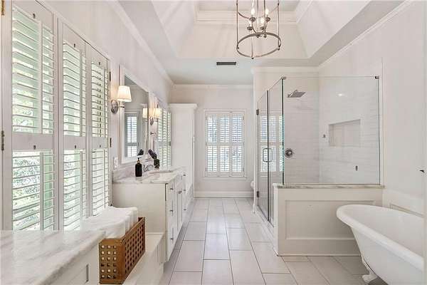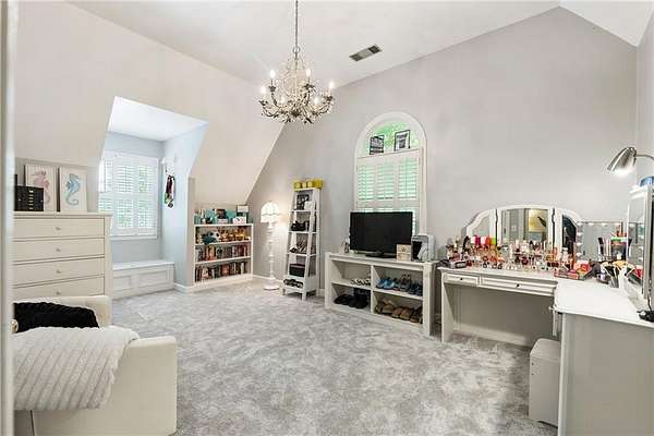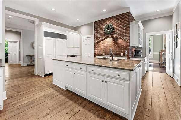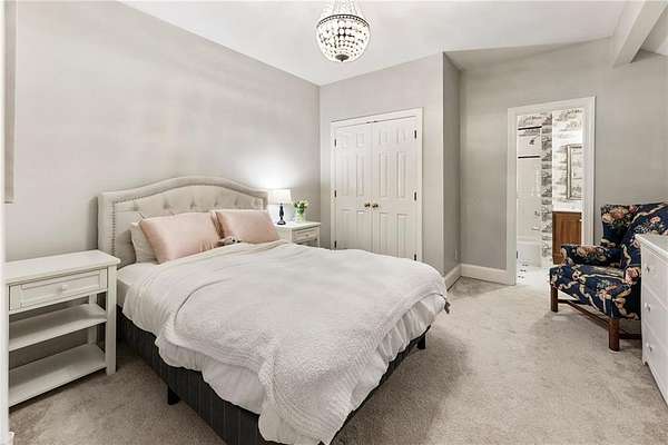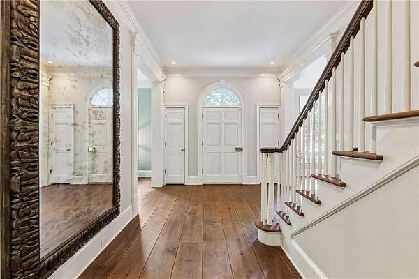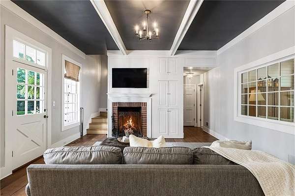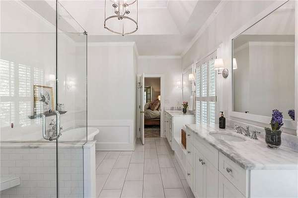 Set on over two acres of private, wooded grounds, this timeless Colonial-style estate, modeled after the Wythe House in Williamsburg, offers a rare blend of classic architecture, modern comfort, and serene natural surroundings within a vibrant neighborhood setting. A picturesque exterior, enhanced by a circular driveway, creates a striking first impression. Inside, 11-foot ceilings, wide-plank heart of pine floors, six fireplaces, fresh interior paint, and new carpet on the upper level add warmth, character, and architectural richness throughout. Designed for both everyday living and effortless entertaining, multiple French doors open to a stunning 64-foot flagstone patio spanning the rear of the home, creating seamless indoor-outdoor flow and peaceful views of the surrounding landscape. The fully fenced backyard offers both privacy and functionality, while a side yard provides the perfect setting for sports or play. The upper level features a true primary retreat with a private sitting room or office complete with French doors and its own fireplace, a generous walk-in closet, and a spa-inspired renovated bath. Flexible living spaces abound, including a private suite in the left wing with two bedrooms, a full bath, and a rear staircase, ideal for guests or multigenerational living. The fourth-floor bonus level adds exceptional versatility with a flex room and multiple walk-in cedar closets. Filled with natural light, the finished terrace level includes a family room, bedroom, full bath, and a wall of windows overlooking the tranquil grounds. With four finished levels, this home offers the best of both worlds: peaceful privacy and natural beauty paired with the benefits of a sought-after neighborhood. Enjoy swim, tennis, pickleball, a playground, and clubhouse, all just minutes from Historic Roswell's dining, shopping, and active community life.